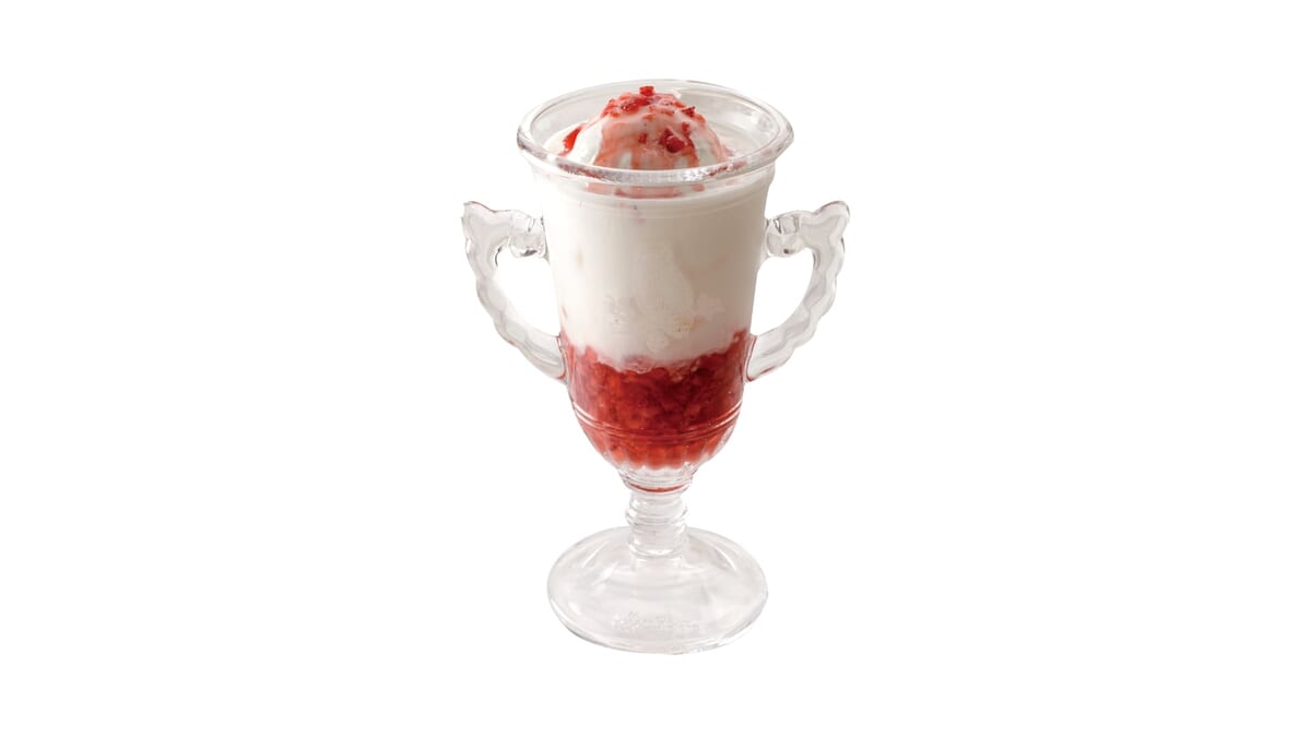 つぶつぶ食感イチゴミルクに、北海道ソフトクリームをトッピングした「びっくりイチゴミルク」
