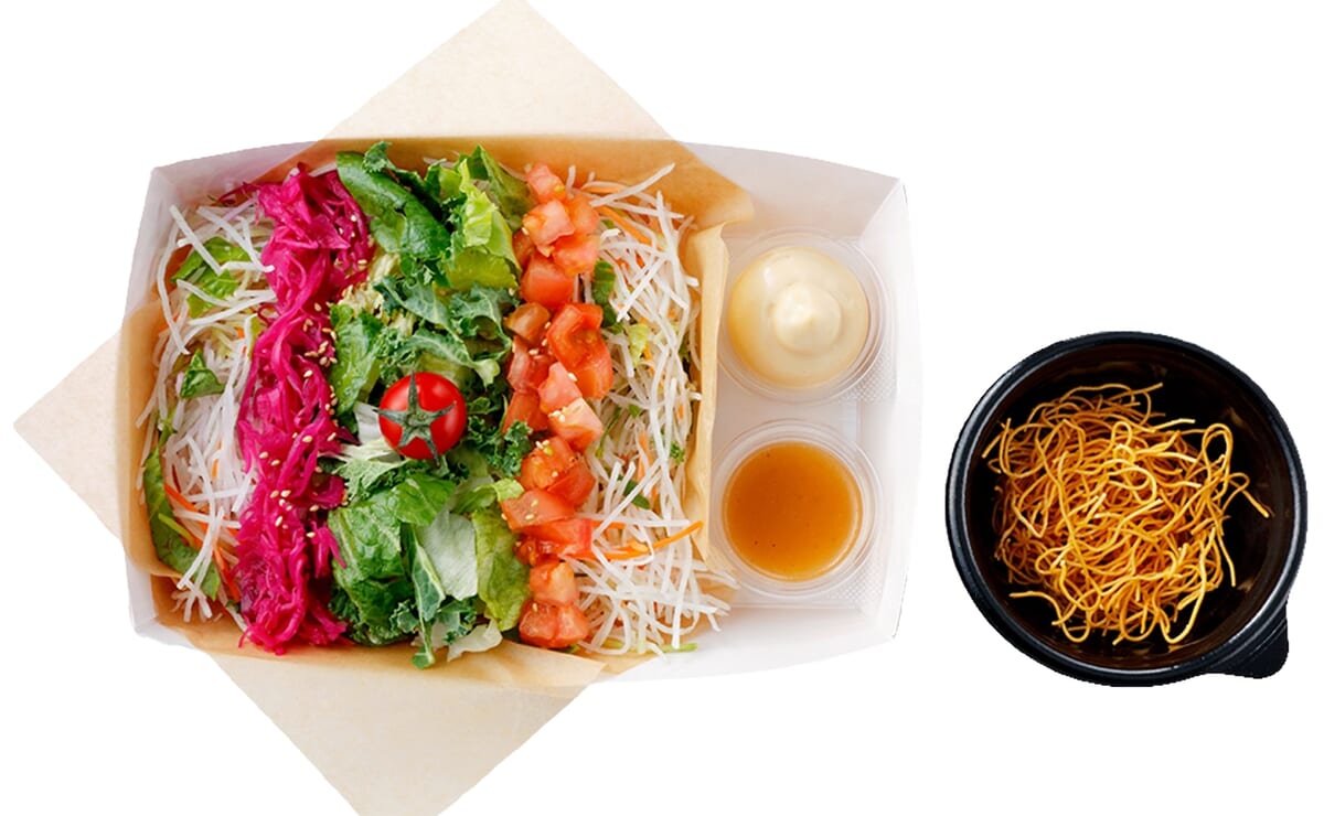 オリジナルドレッシングとマヨネーズ風ドレッシング2層の味が全体に行き渡り、紫キャベツピクルスの酸味と甘味がアクセントになっています。