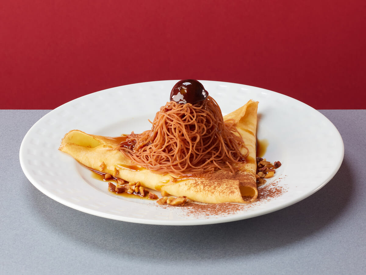 クリーミーな味わいのマスカルポーネムースを包んだもちもちのクレープに、小さなモンブランをのせた欲張りなプレート。