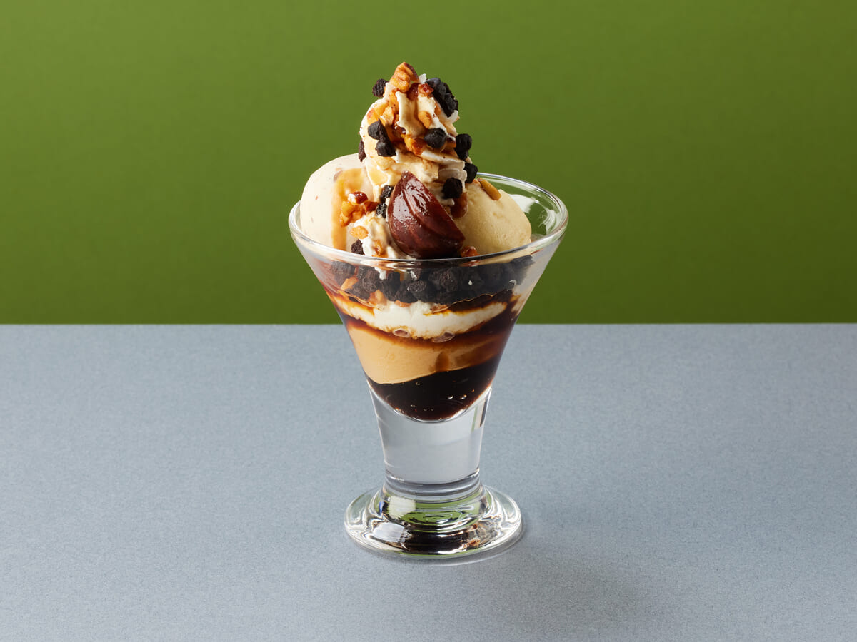 渋皮栗アイスと栗の渋皮煮の上品な甘さが楽しめる、食後にぴったりなサイズのミニパフェ。