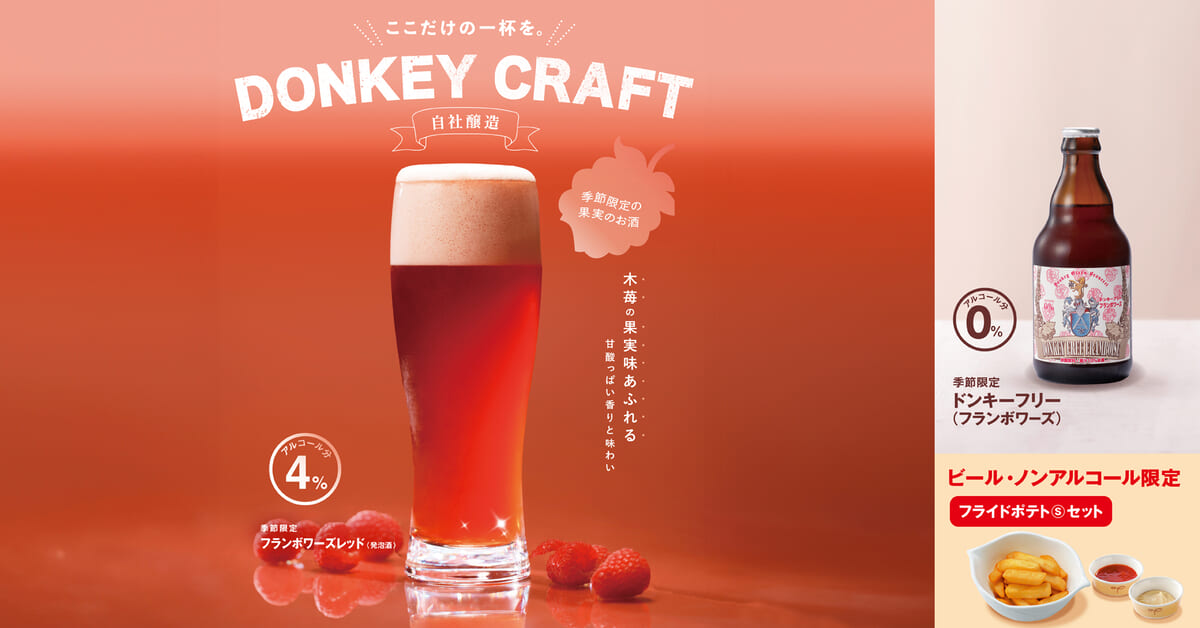 びっくりドンキーが、季節のお酒「フランボワーズレッド」とノンアルコールの「ドンキーフリー(フランボワーズ)」を販売。