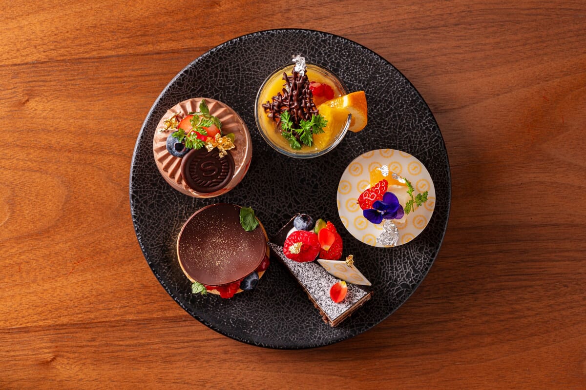 - 1段目:ショコラのヴェリーヌ/オペラ/タルトショコラ/ミルクチョコのパンナコッタ/シードルジュレ