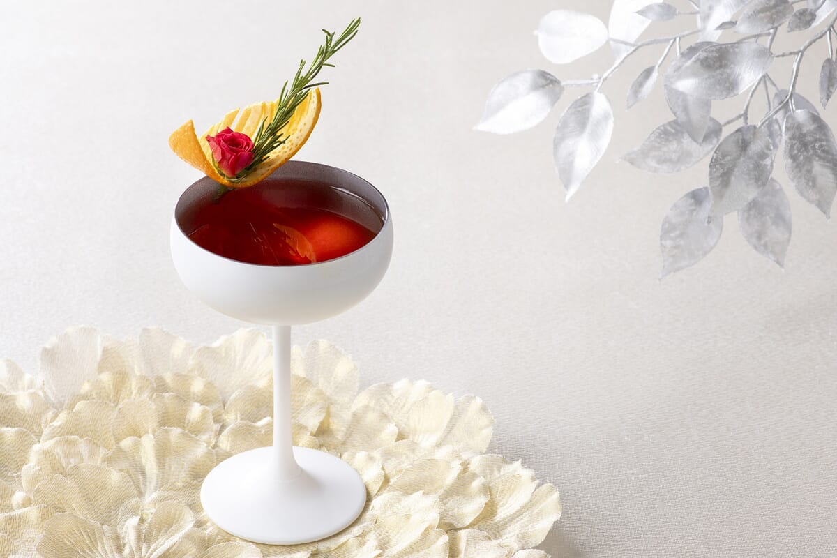 真っ白な雪をイメージしたグラスに、オレンジピールやバラ、ローズマリーを添えて華やかに仕上げられています。