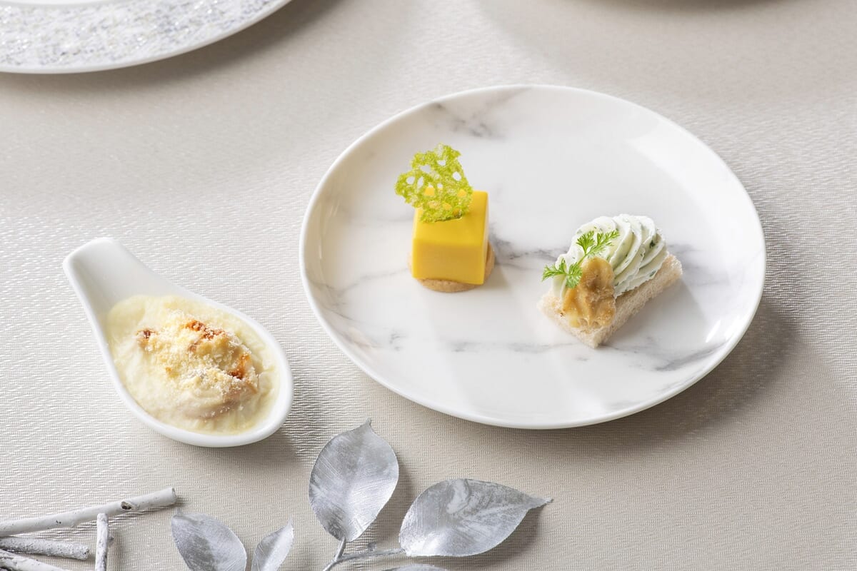 「ズワイガニとブロッコリーのサラダ」は旬のズワイガニを使用し、祝祭感を感じられる色合いが美しいセイボリー。