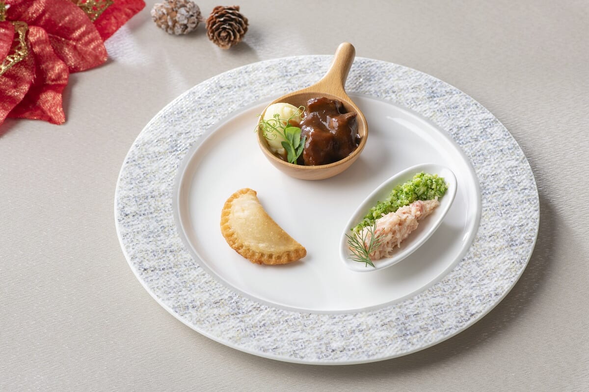 “エンパナディージャ” タコとトマトソースのパイ包み揚げ/国産牛の赤ワイン煮込み ブルゴーニュ風/ズワイガニとブロッコリーのサラダ