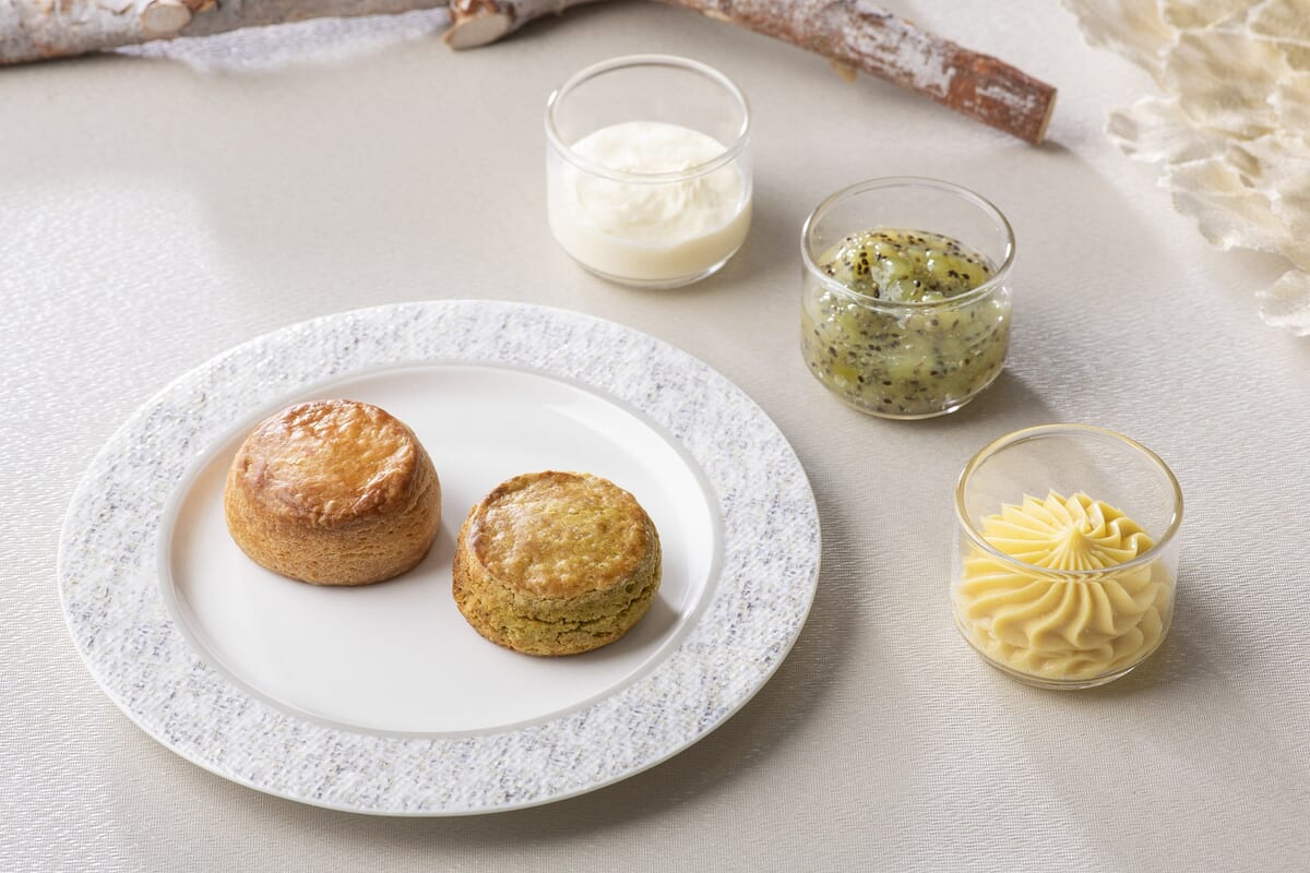 プレーンスコーン、ピスタチオスコーン/クロテッドクリーム、キウイ&チアシードジャム、イタリアンマロンクリーム