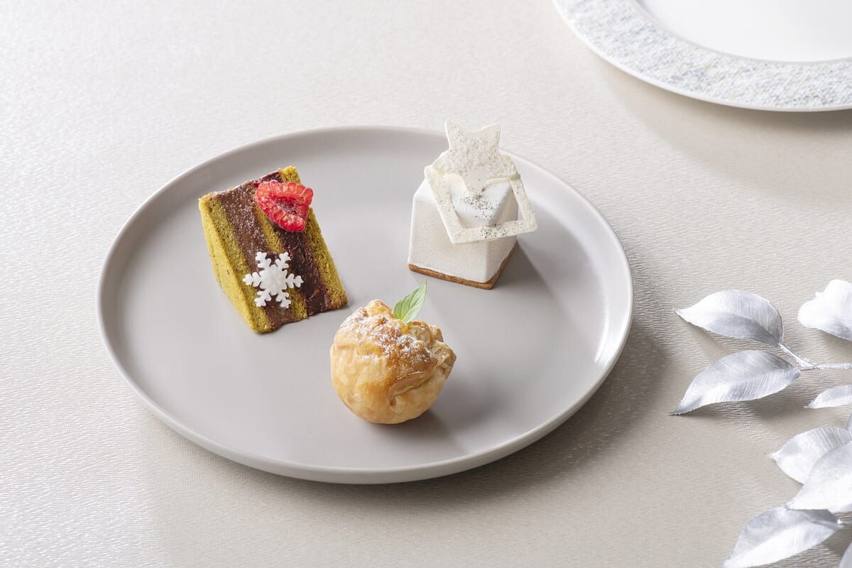国産牛の赤ワイン煮込みや苺をまるごと一粒使ったマカロン、雪だるま形のチョコレートをのせたかわいいグラスデザート、2つの味が楽しめるピスタチオケーキなど全14種類のメニューを楽しめます!