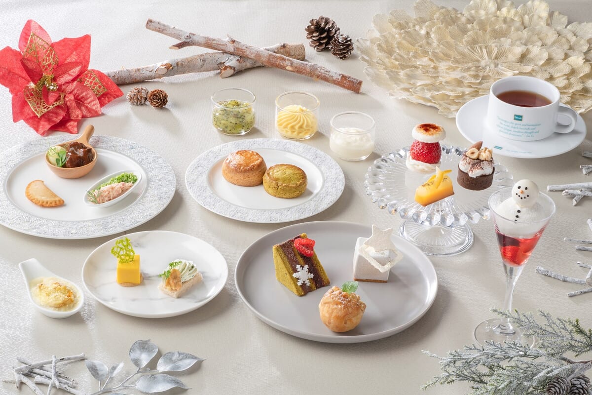 まるごと一粒の苺をサンドしたマカロンや、雪だるまの形をしたチョコレートをのせたグラスデザートなどを楽しめます☆