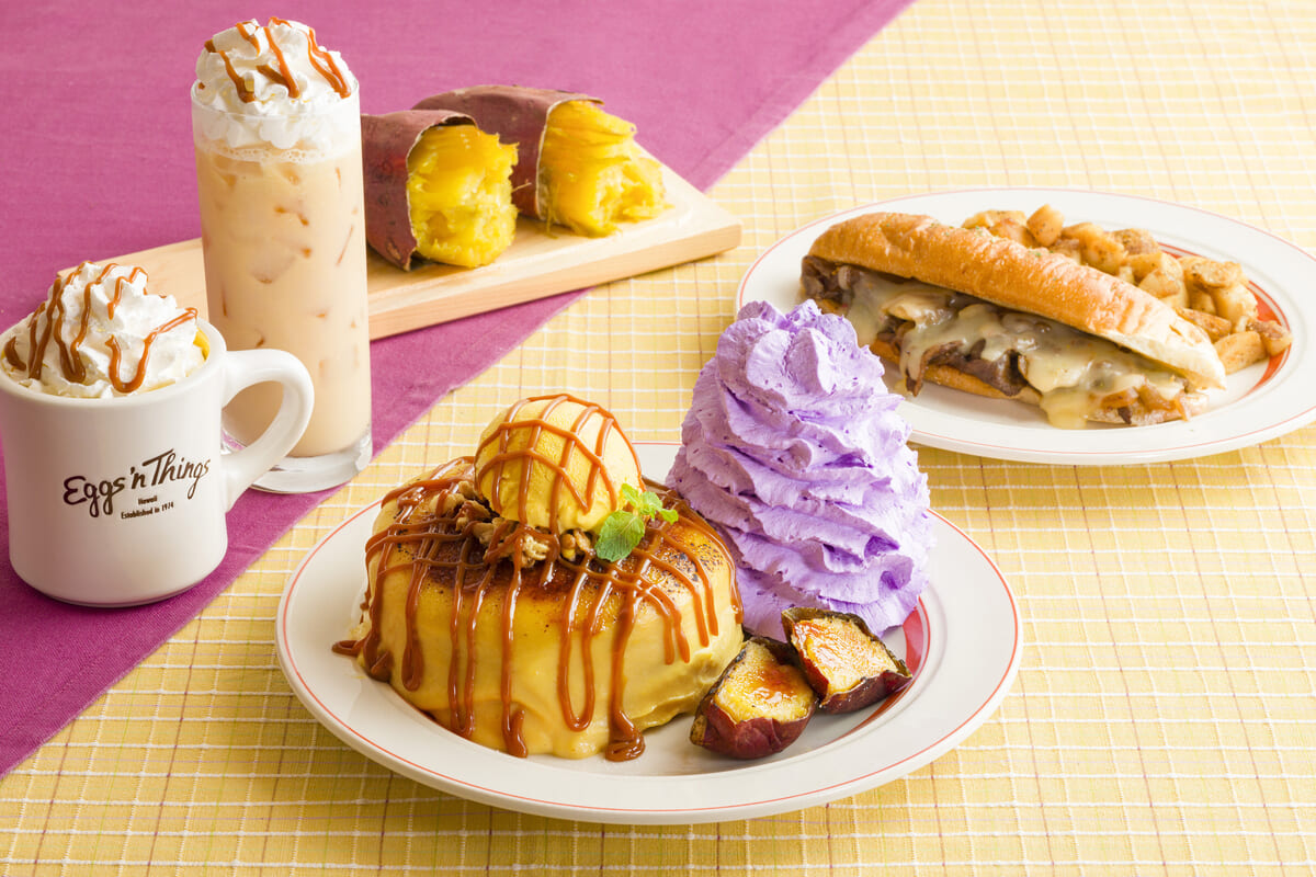 「焼き芋ブリュレパンケーキ」「フィリーチーズステーキサンド」「さつまいもティーラテ」は、2024年10月25日から11月28日までの期間限定で、国内の「Eggs ’n Things」と「Eggs ’n Things Coffee」全店舗にて販売開始です。
