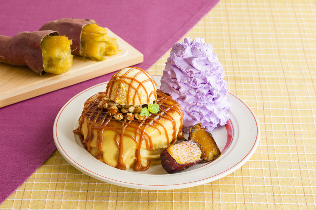 毎年人気の「焼き芋ブリュレパンケーキ」は、ブリュレしたスイートポテトクリームで包み、香ばしいキャラメルソースで仕上げた濃密なパンケーキです。