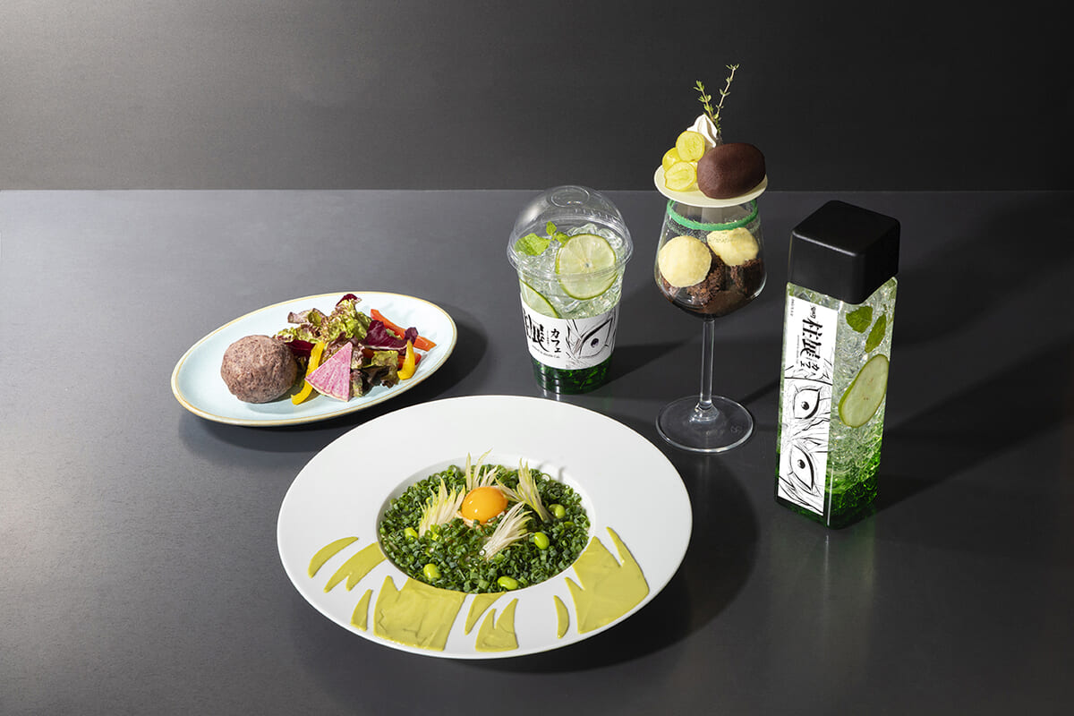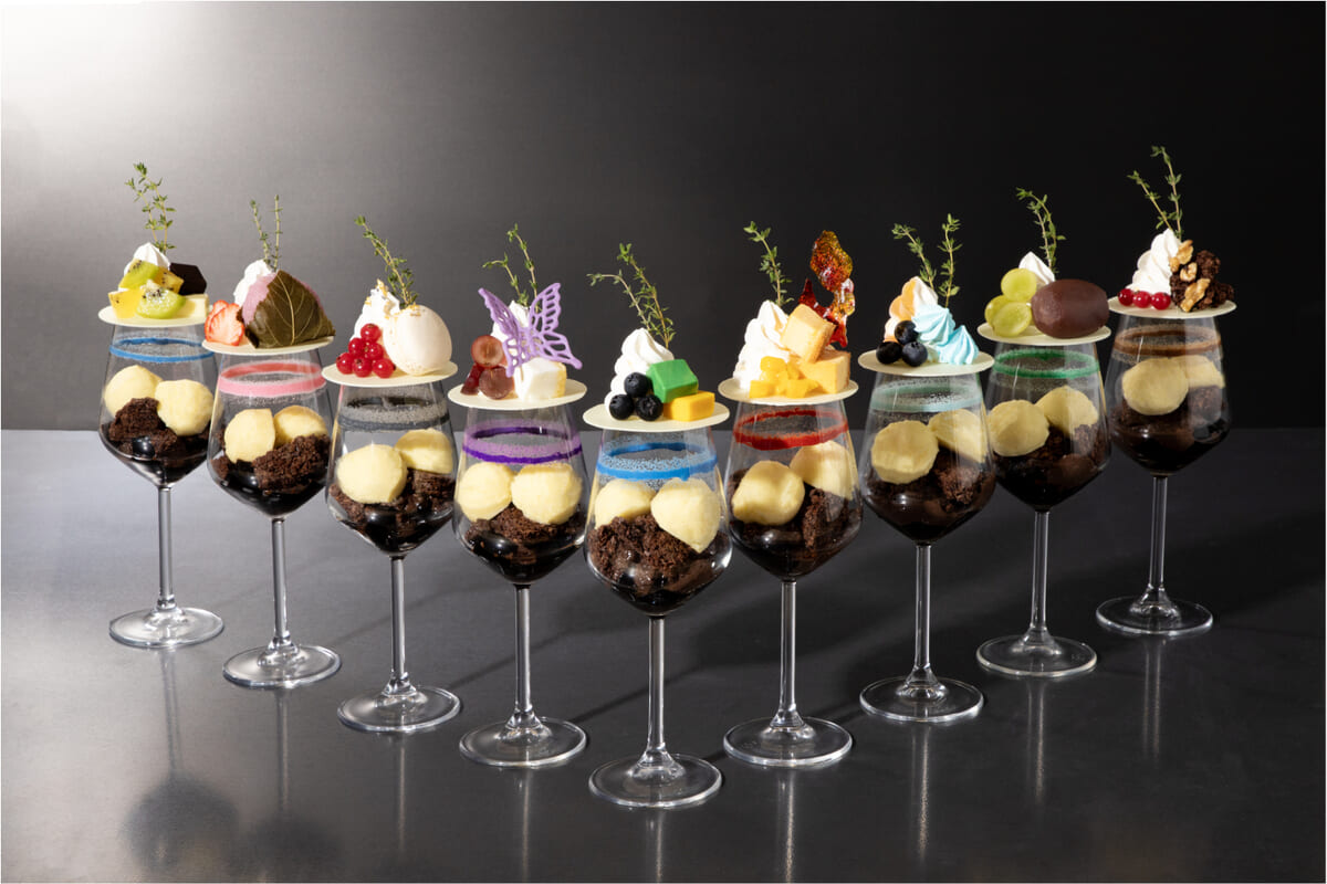 味覚や嗅覚などの食の五感で楽しめるフードメニュー9品、デザートメニュー9品、ドリンクメニュー9品、ボトルドリンク9品をラインナップ。