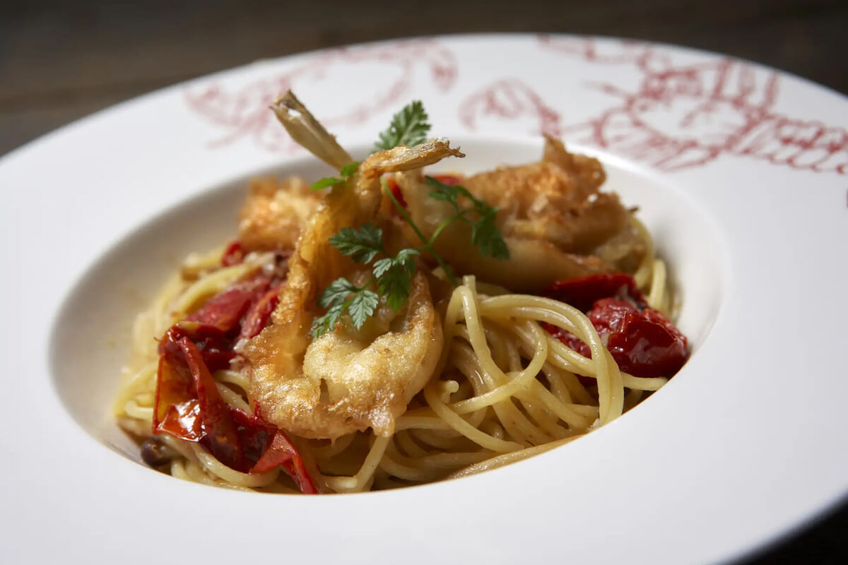 フグのフリットの繊細な旨味とセミドライトマトの甘酸っぱさによる絶妙なバランスを楽しめる「フグとセミドライトマトの贅沢ペペロンチーノ」