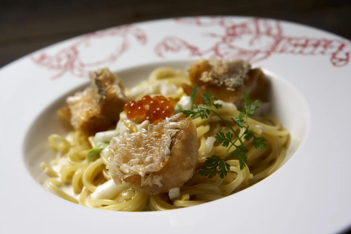パリパリ食感の鱗がクセになる「甘鯛の鱗揚げと白菜の柚子クリームパスタ」
