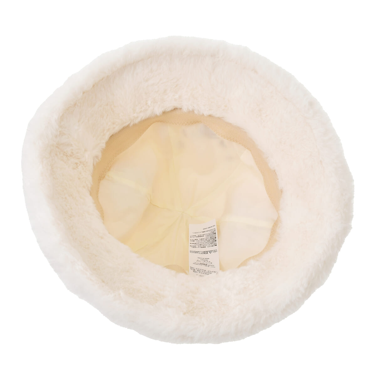 眉尻を下げ、ちょっぴりお口を開いた「くまのプーさん」のお顔が目を引くルーツラテカラーのフェイクファーのハット。