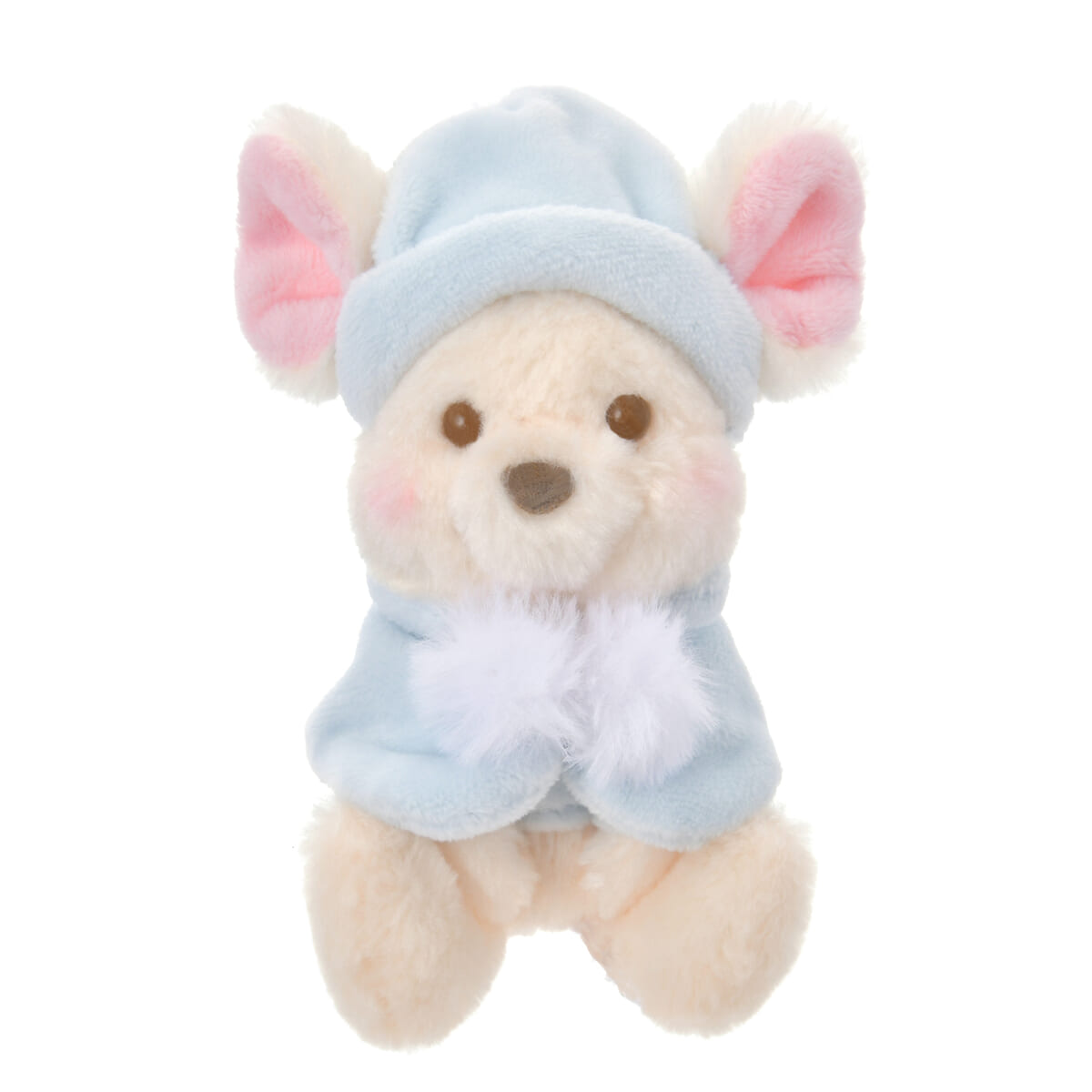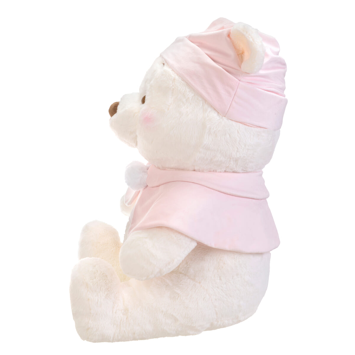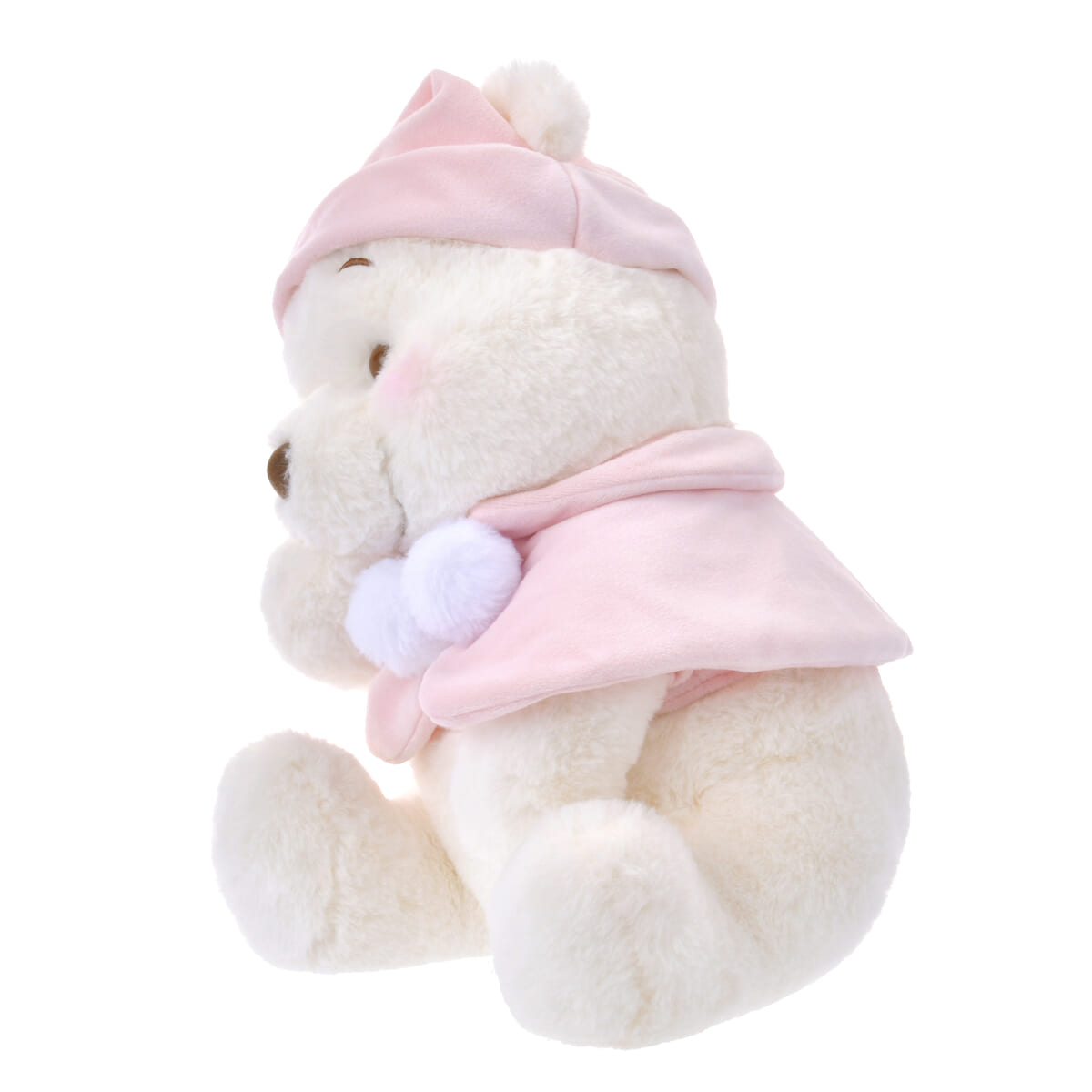 限定カラーのプーさんのぬいぐるみとぬいぐるみキーチェーンは、ピンクのケープと帽子を身にまとい、手を口に添えてお座りした愛らしいポーズが魅力です。