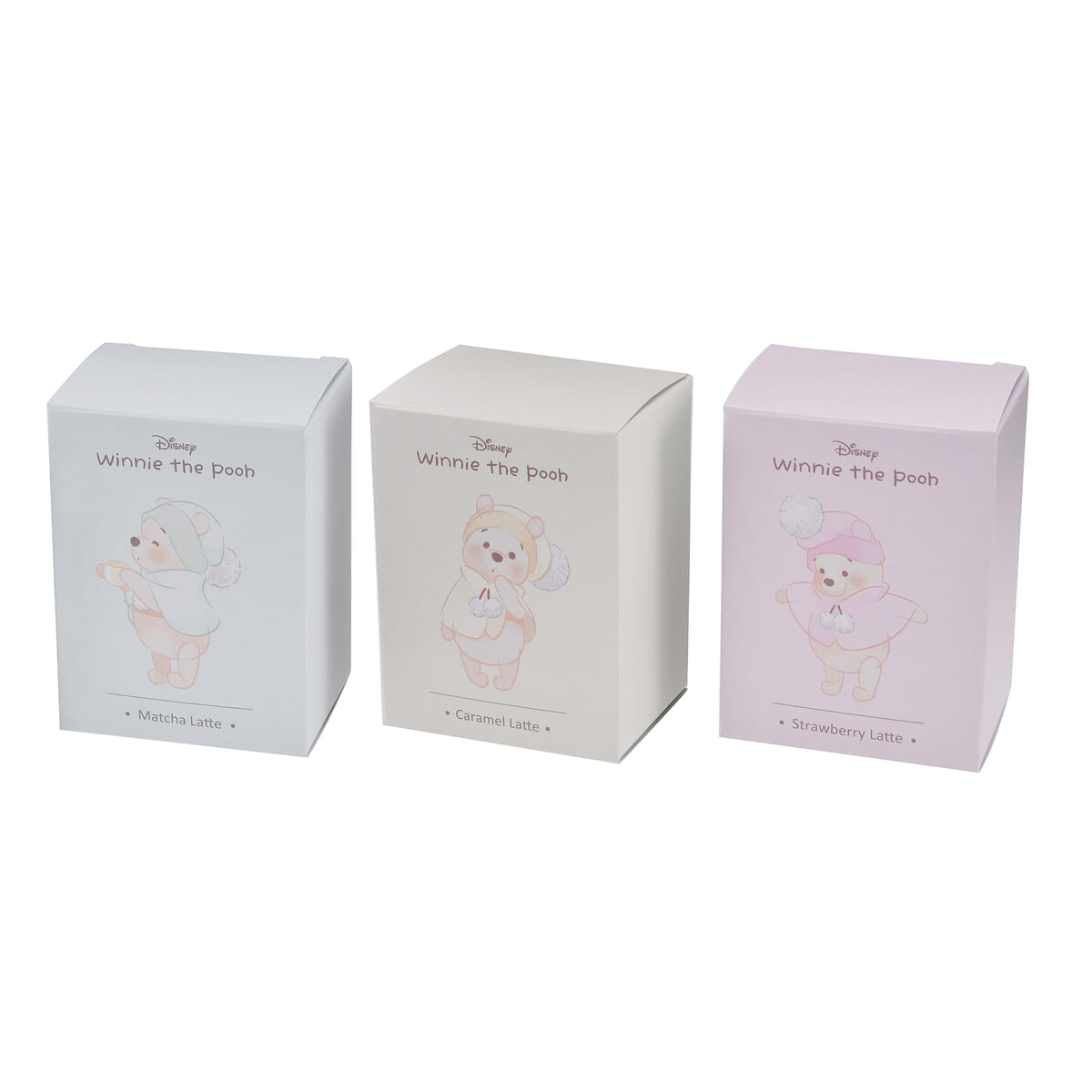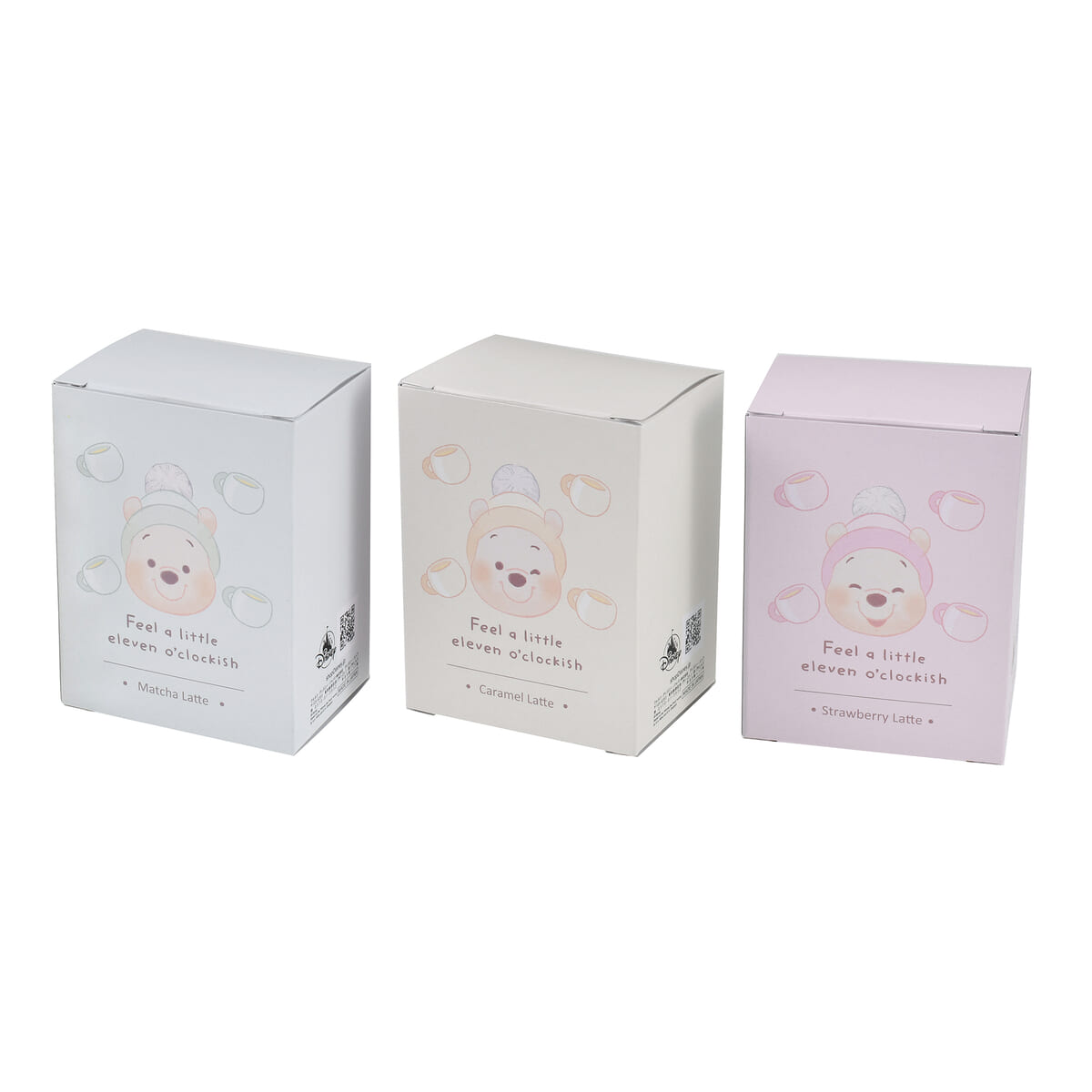フルーツラテをテーマに、淡くやさしい色味のケープと、大きな白いポンポンがついた帽子を身につけた「くまのプーさん」と仲間たちが、ふんわりとやわらかいタッチで描き起こされています。