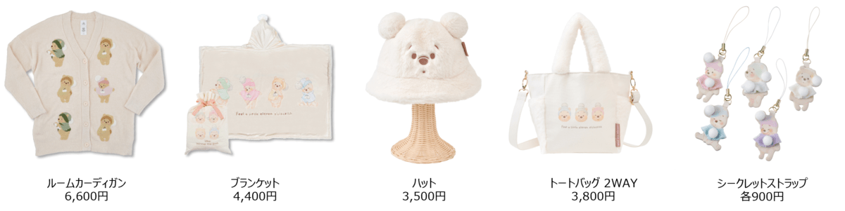 また、寒い季節にぴったりのルームカーディガンや、フードを被るとポンチョのように使用できるブランケット、ヘアバンドやルームソックスなど、おうち時間がさらに楽しくなるグッズも充実しています。