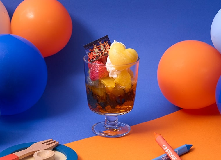 『ティガー・ムービー/プーさんの贈りもの』のワンシーンを切り取ったピックとハート型のロケットをイメージしたモナカがのったパフェ。