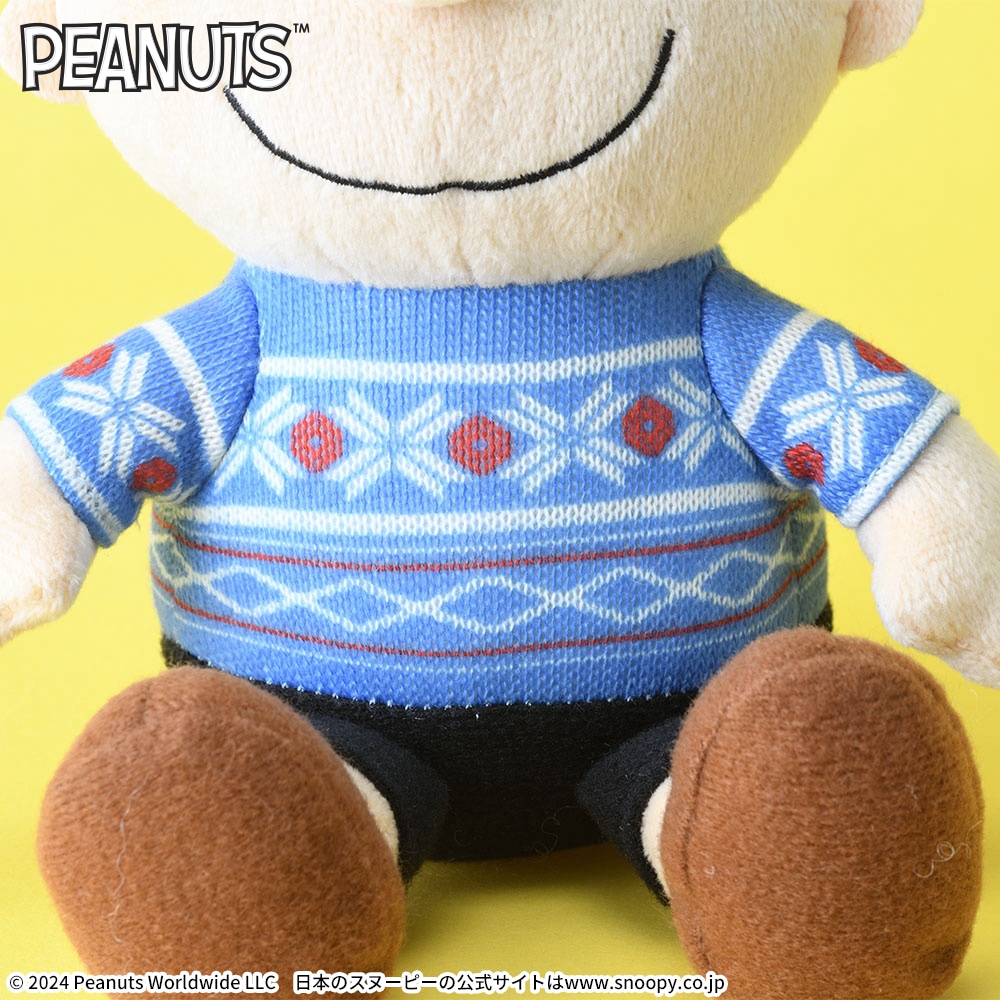 冬にぴったりなノルディック柄のセーターを着たデザインの「スヌーピー」「チャーリー・ブラウン」「ウッドストック」のぬいぐるみ。