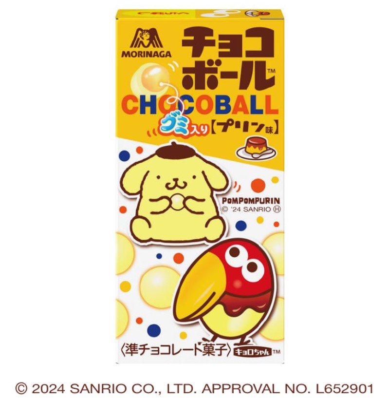「プリンキョロちゃん」と「ポムポムプリン」が目印の、もちもちグミ入りのプリン味「チョコボール」
