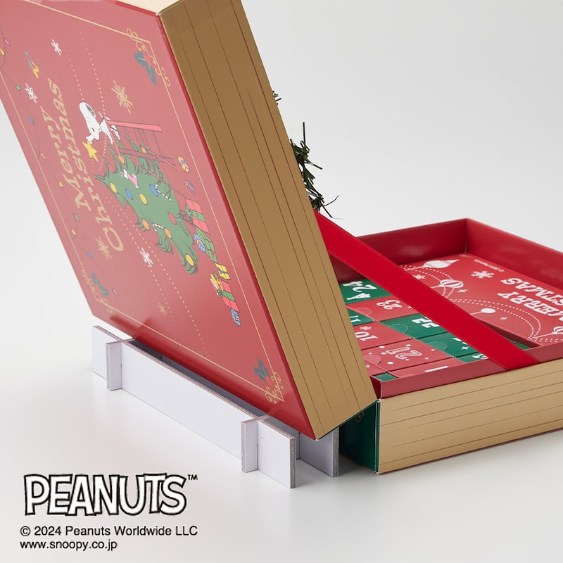 本をモチーフにした収納箱に、24種類の『PEANUTS』の仲間たちをデザインしたミニオーナメントが付いた豪華なセットです。