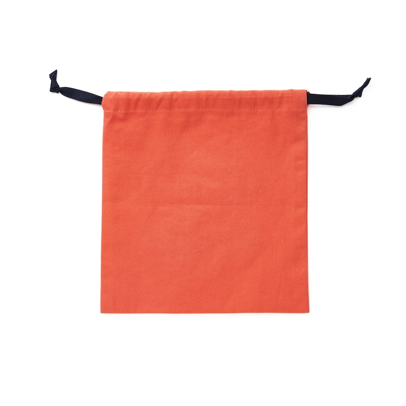 鮮やかなオレンジの布×ネイビーのひもを用いた配色がおしゃれな巾着。