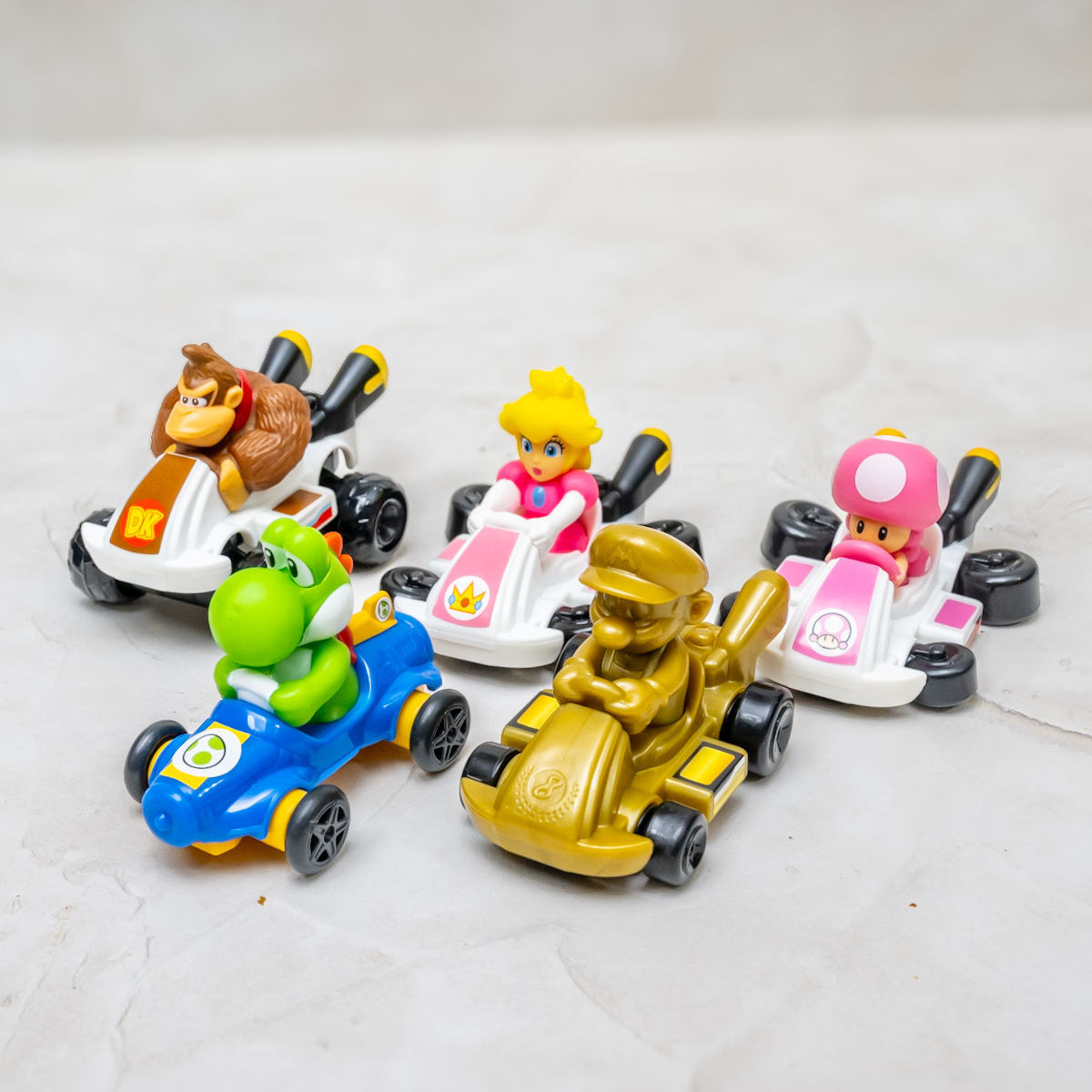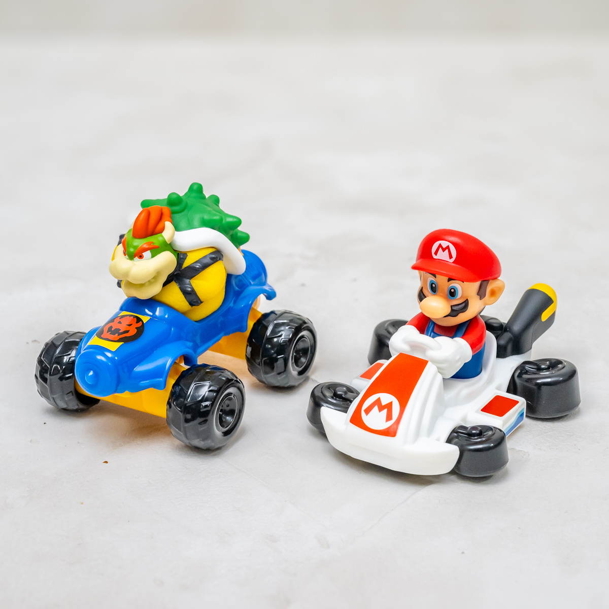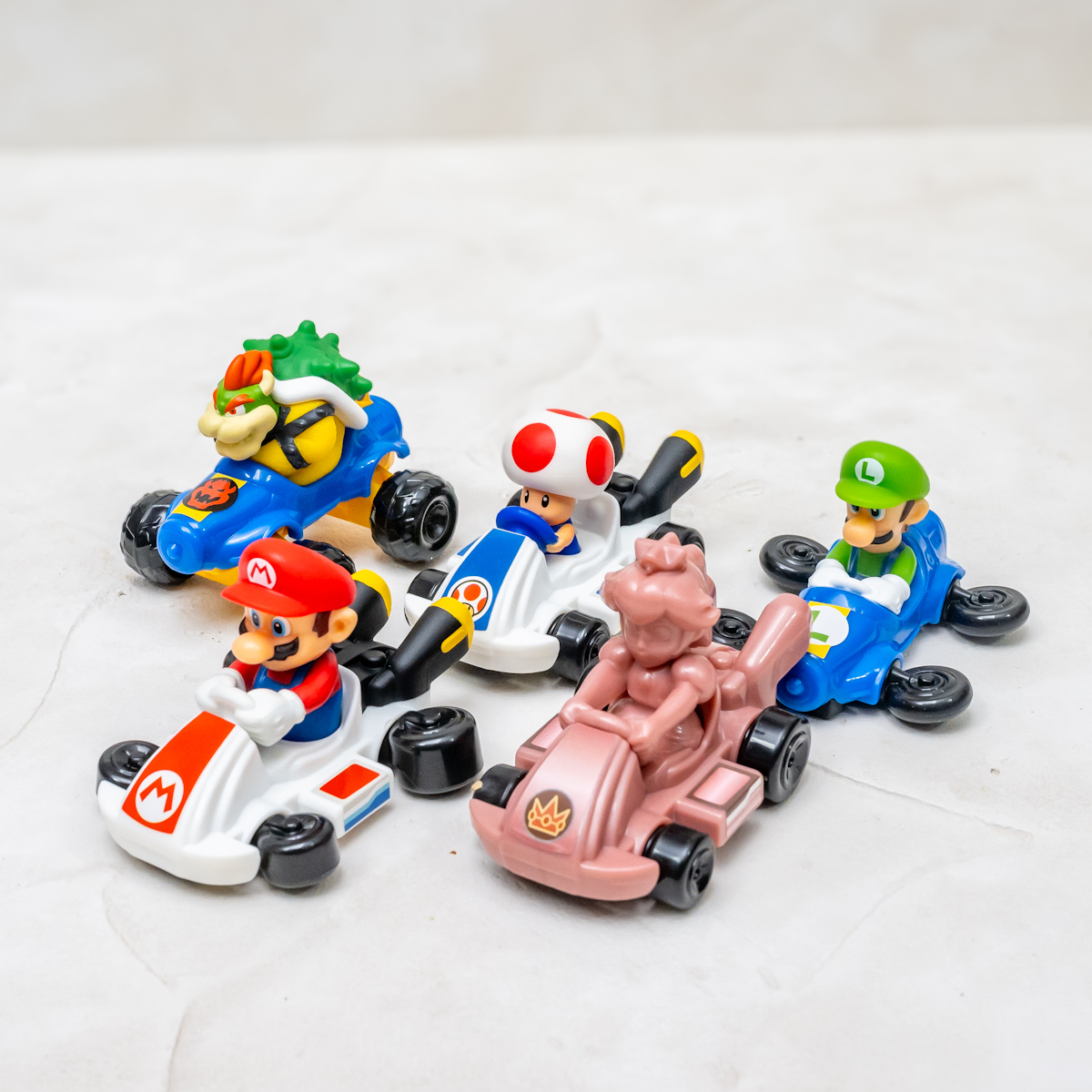 ハッピーセット「マリオカート」のおもちゃは、「マリオ」や「ルイージ」「クッパ」などのキャラクターたちが、カートに乗った姿を再現。