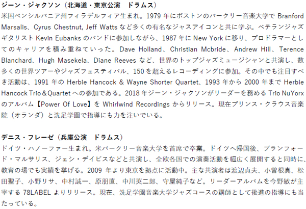 北海道・東京公演はジーン・ジャクソンさんが、兵庫公演ではデニス・フレーゼさんがドラムスを担当します。