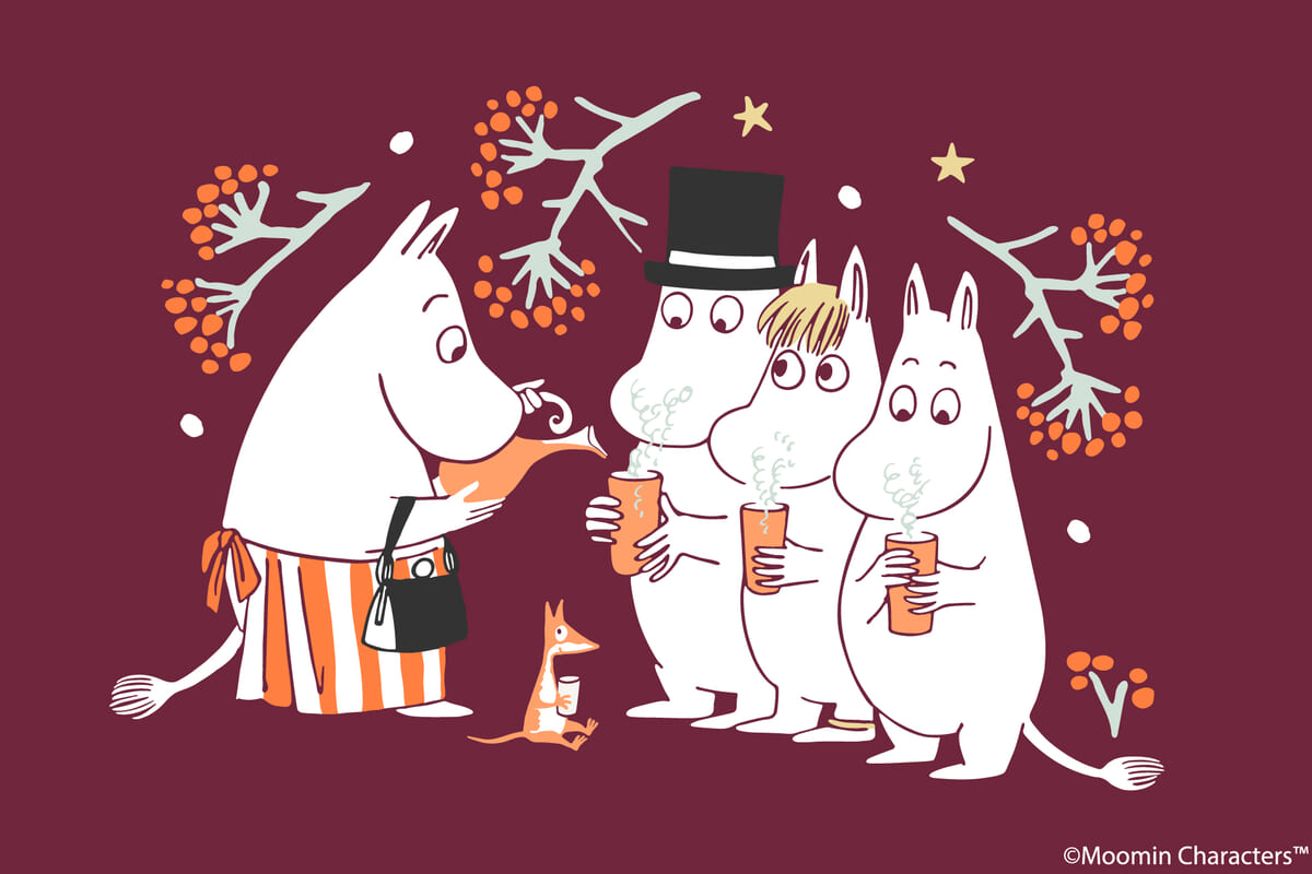 「ムーミン」一家が雪の中で思い思いに冬のパーティーを楽しむ様子が描かれており、大切な誰かと過ごす雪の日の特別なひとときが感じられるデザインが展開されます。