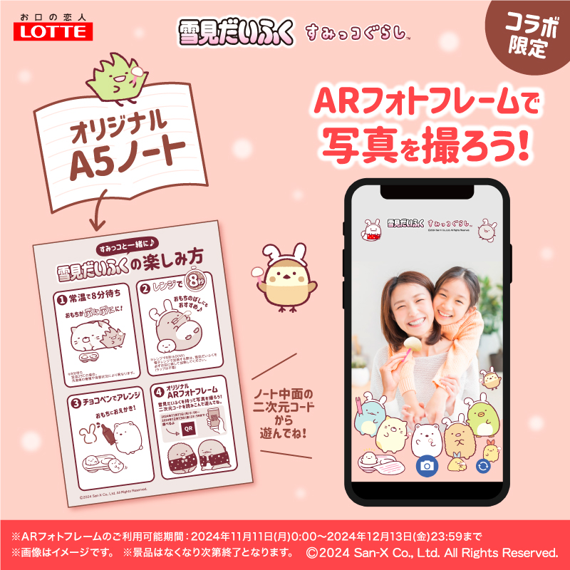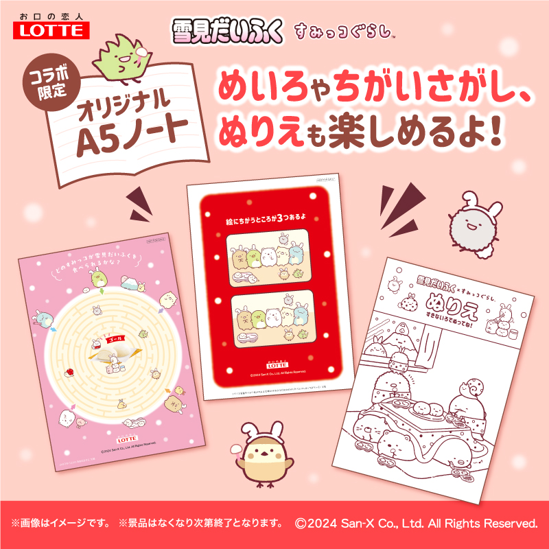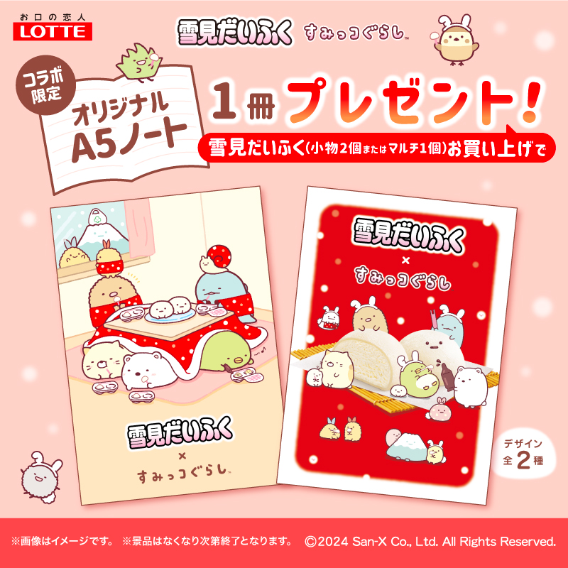 全国の一部スーパーマーケットにて、雪見だいふく小物2個またはマルチ1個を購入された方に「雪見だいふく×すみっコぐらし」コラボ限定オリジナルA5ノートがその場でもらえるキャンペーンを実施中。