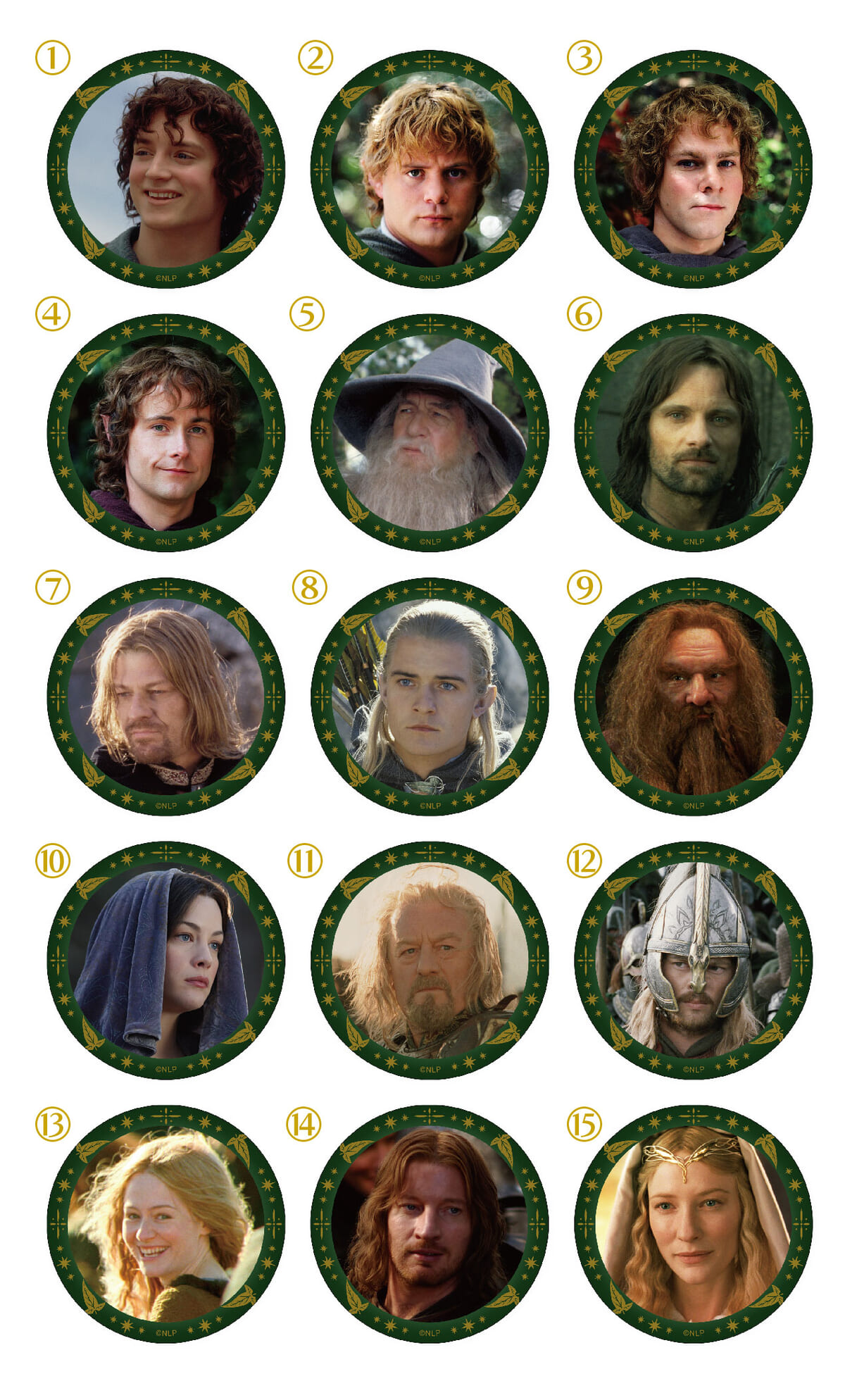 「フロド・バギンズ」や「レゴラス」「ギムリ」「ガンダルフ」たちをプリントした缶バッジコレクション。