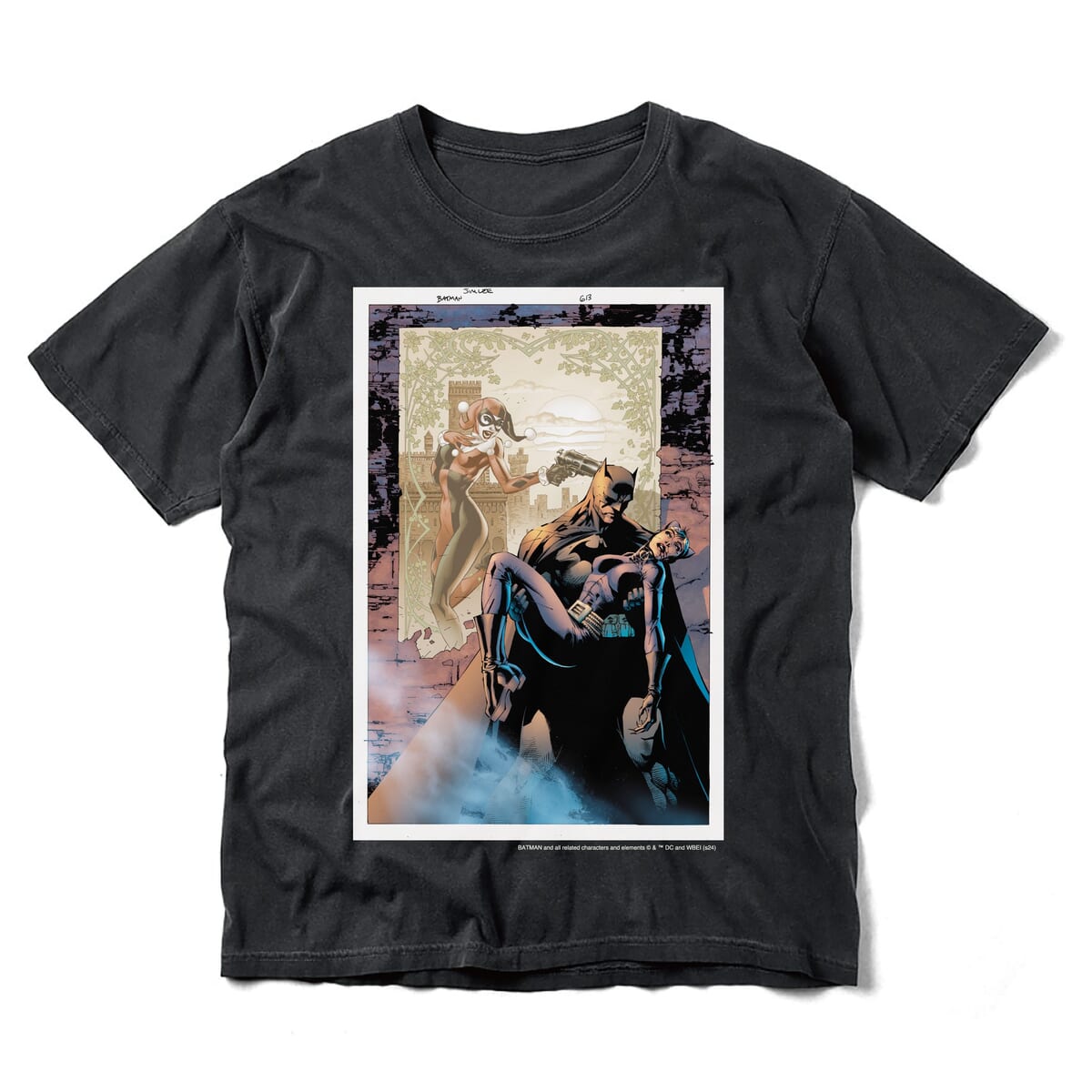 傷ついた「キャットウーマン」を抱く「バットマン」をプリントしたTシャツ。