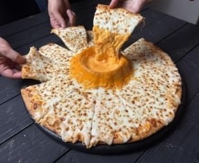 ピザの真ん中に火山のようにそびえる「チーズボルケーノ」部分と合わせて、チェダーチーズソースが280g、モッツァレラチーズが720gと、ピザ全体で1kgのチーズを使用。
