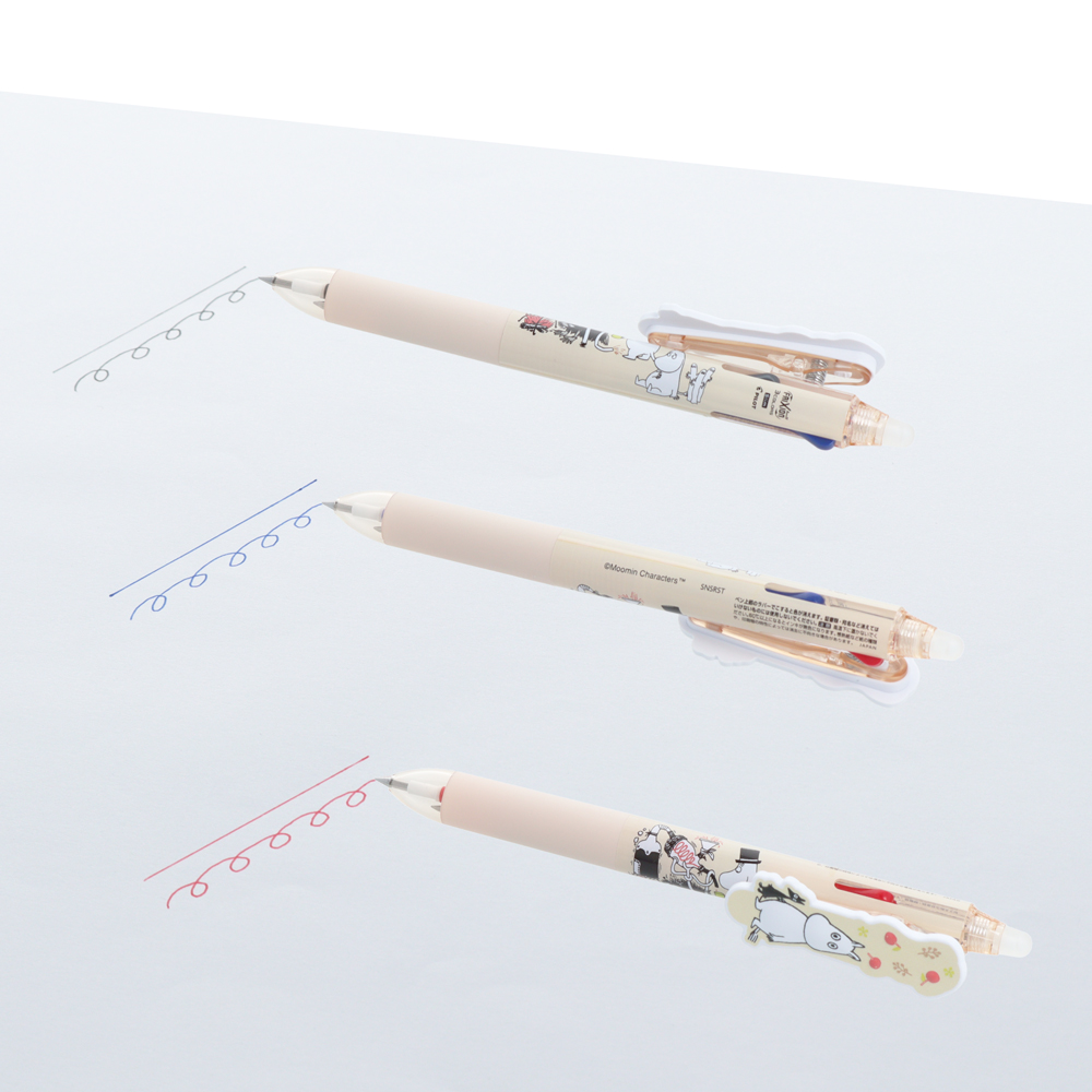こすって消せるボールペン「フリクションボール3スリム」のクリップ部分に、「ムーミン」たちのプレートをあしらった筆記具。