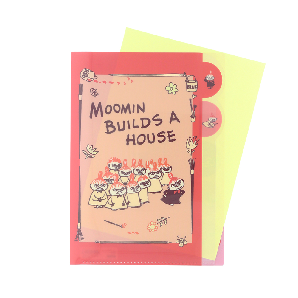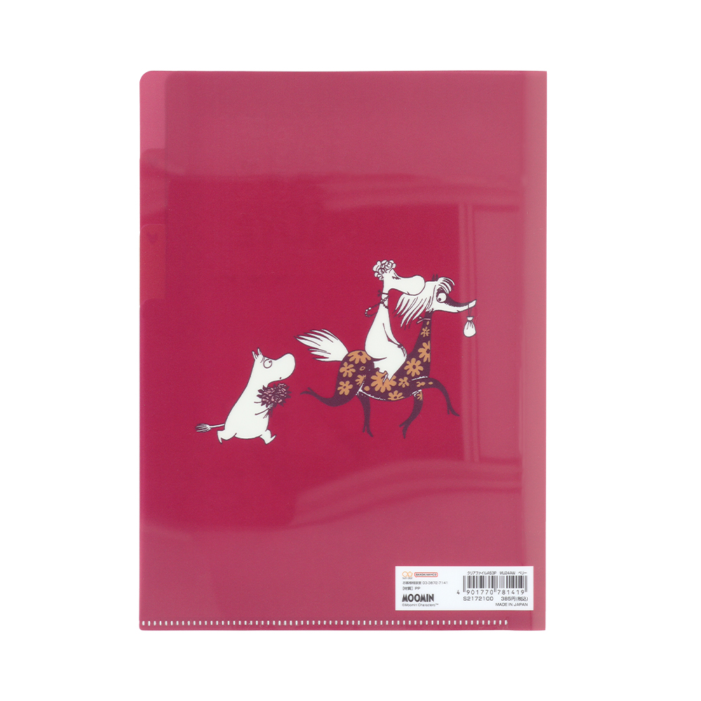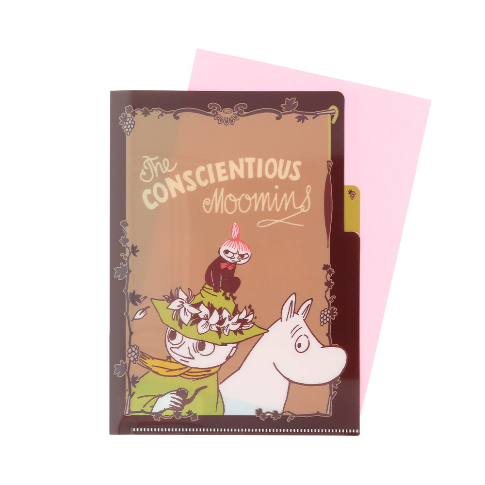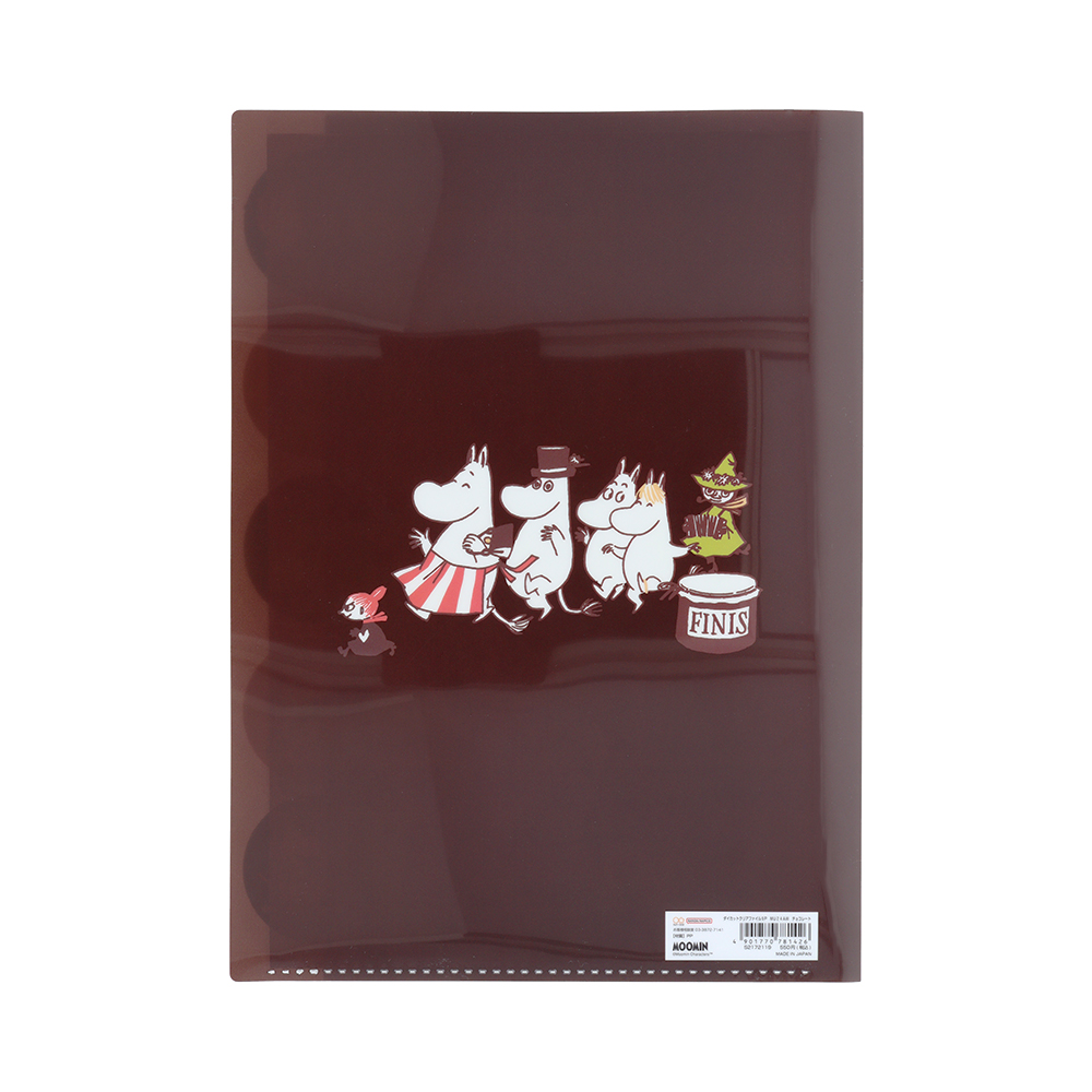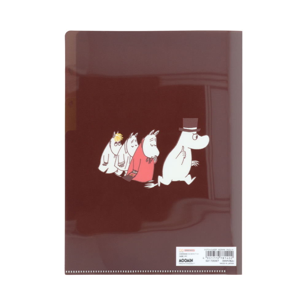 チョコレートカラーのクリアファイルに、白のラインアートで「ムーミン」たちを描いたデザイン。