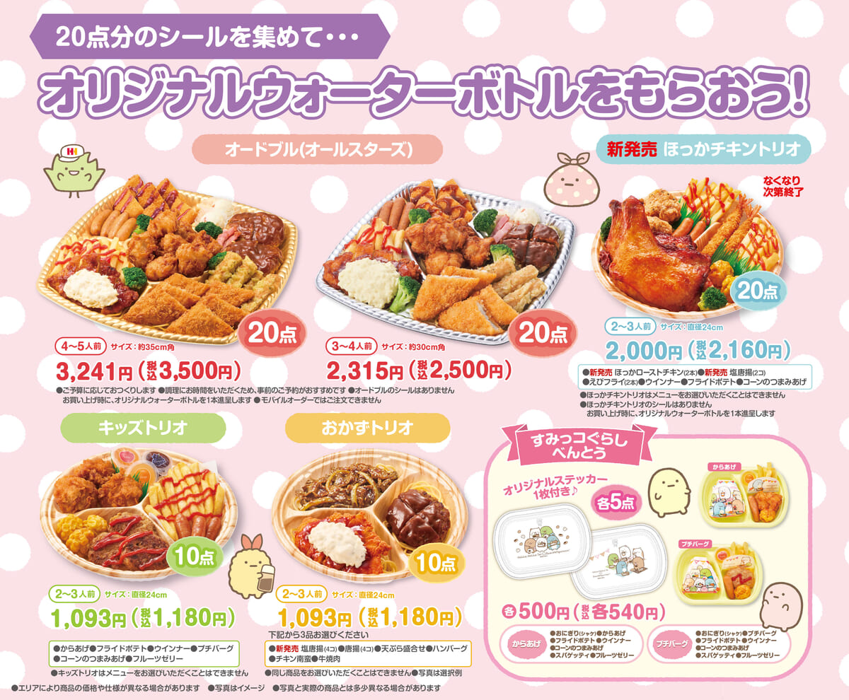 ほっかほっか亭の「すみっコぐらしべんとう」や「各種オードブル」「おかずトリオ」「キッズトリオ」に加え、新発売の「ほっかチキントリオ」など、総額税込み2,000円相当を購入すると、先着で好きなデザインのオリジナルウォーターボトル全5種からいずれか1つがもらえます☆