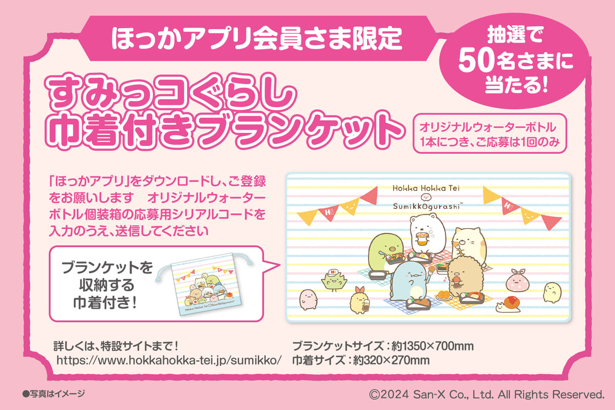 オリジナル ウォーターボトルの個装箱の裏側に貼付されている応募シリアルコードを、ほっかアプリの特設ページに入力のうえ応募すると、抽選で計50名に「すみっコぐらし 巾着付きブランケット」がプレゼントされる企画です。