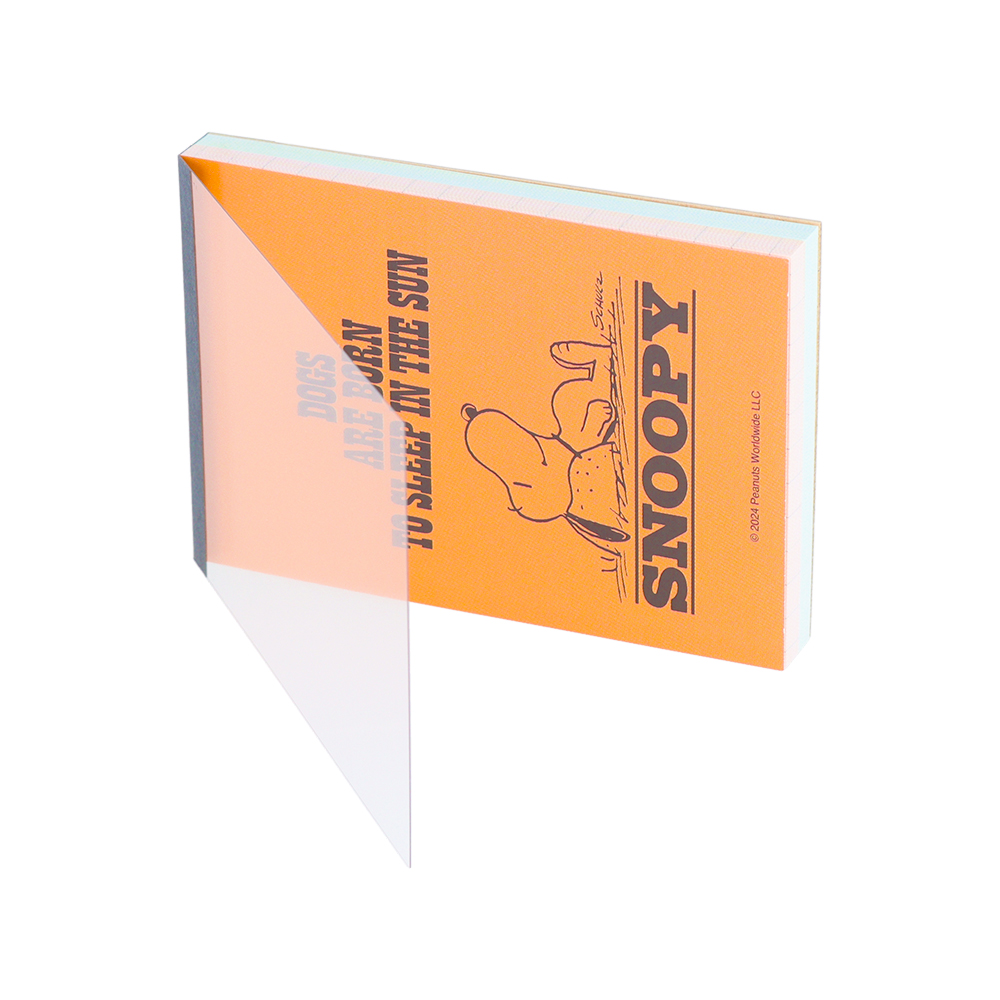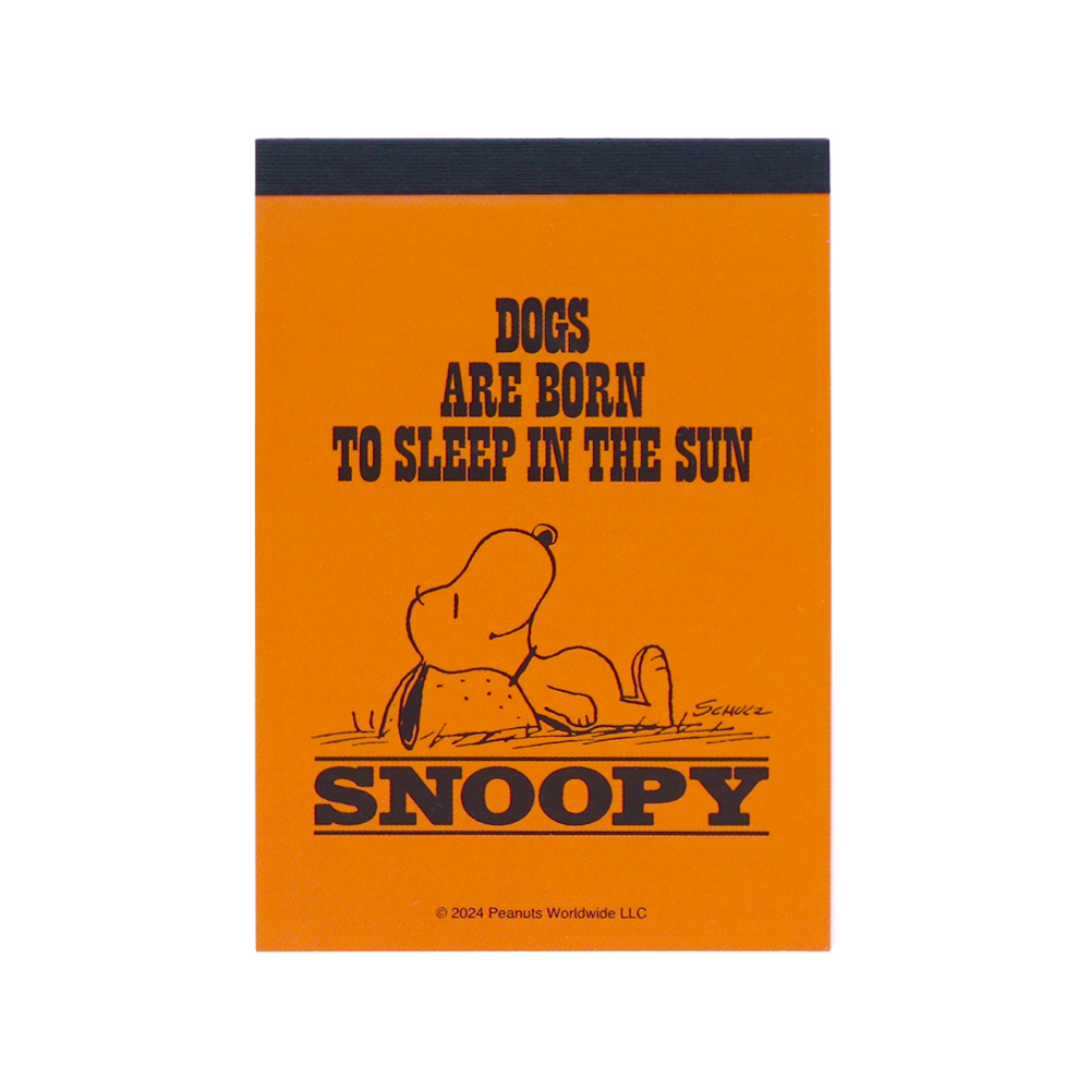 太陽の下ですやすや眠る「スヌーピー」のイラストがかわいい、オレンジのメモミニ。