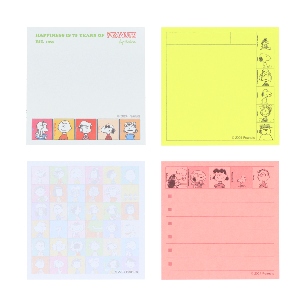 そのほか、ビビッドな蛍光イエローの柄、グリッドに配置された「スヌーピー」とその仲間たちのイラストがかわいい柄、そして、毎日のToDoリストに使いたくなる蛍光ピンクの柄の4種類が1セットに。