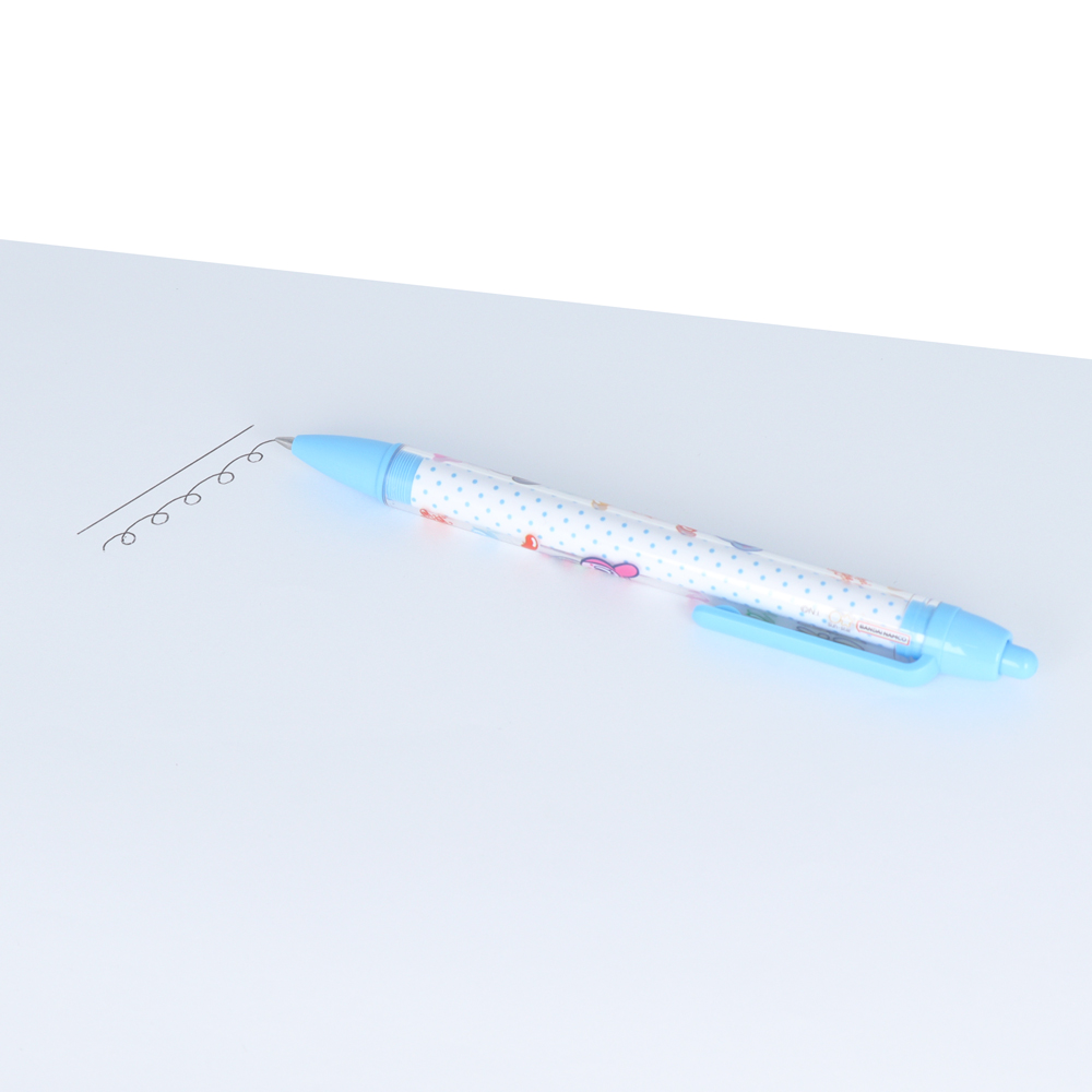 軸全体にキャラクターのイラストが散りばめられ、クリップやノック、ペン先はブルーのデザインです!