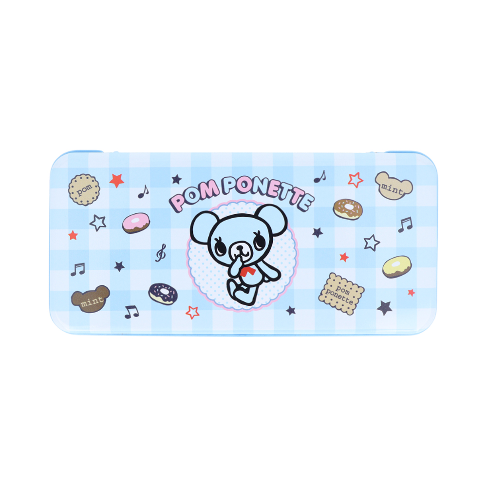 淡いチェック柄と、お菓子のモチーフが可愛い「ポンポネット ジュニア」の缶ペンケース。