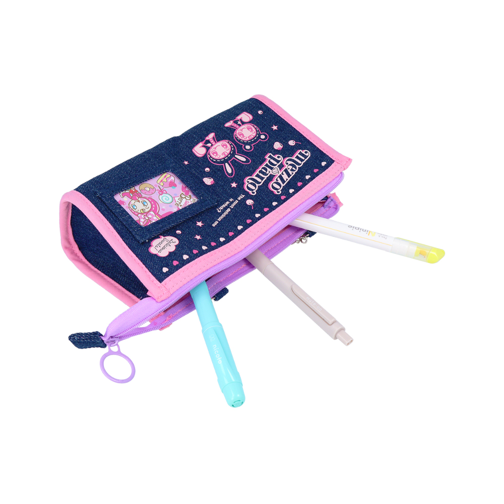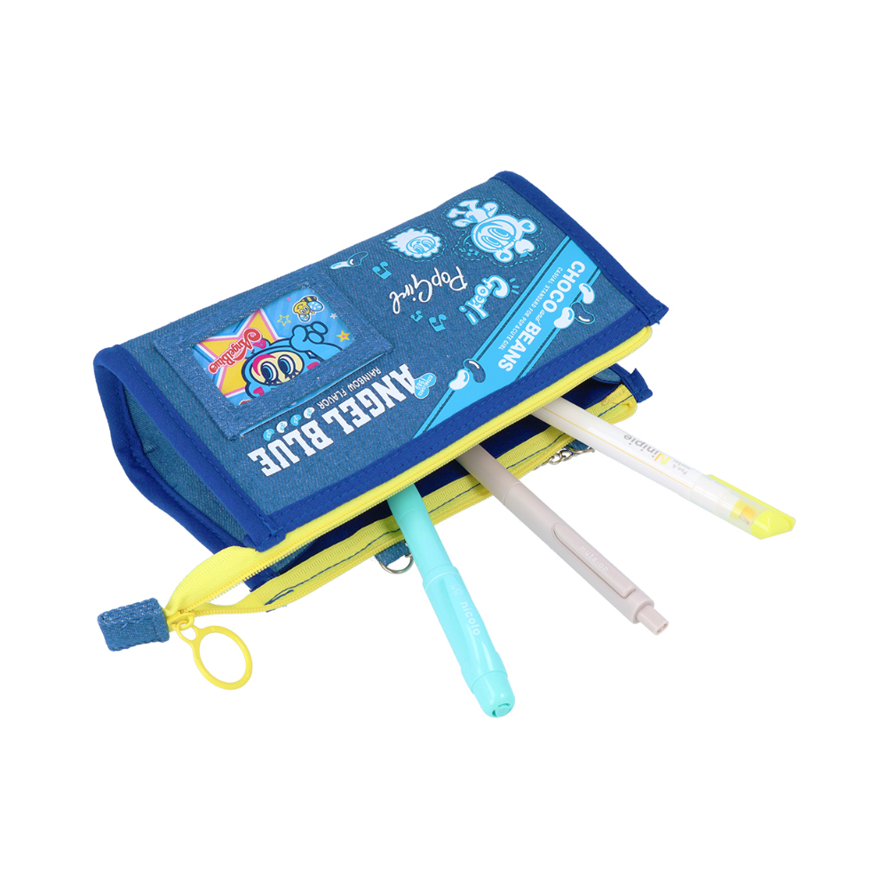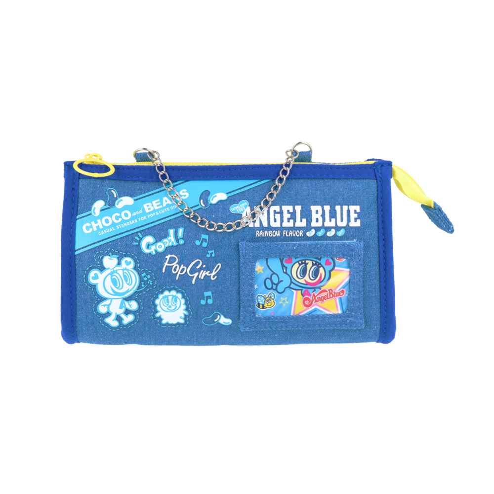 デニム生地に「エンジェルブルー」のキャラクターたちが映えるポーチ。