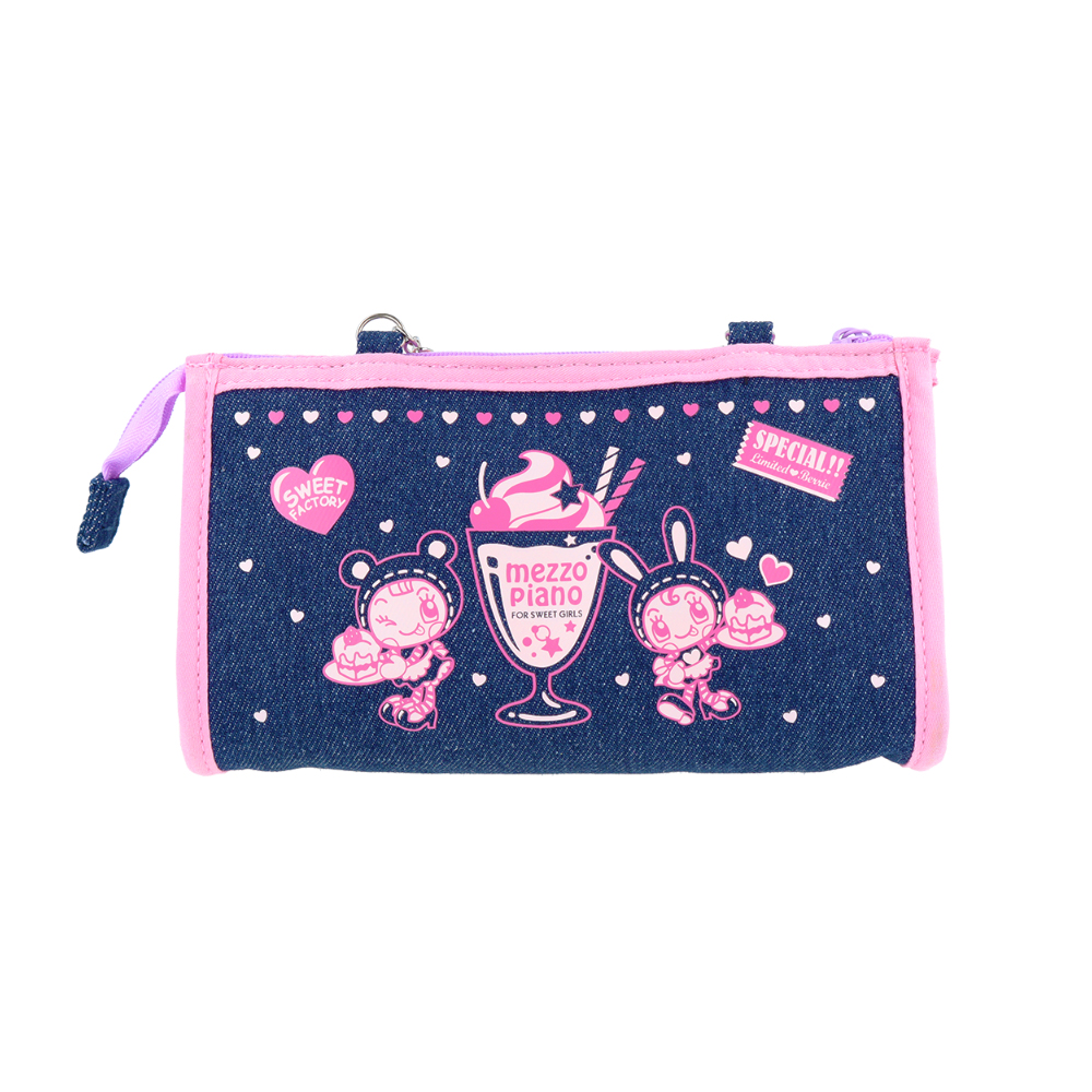 デニムのポーチにあしらった「メゾピアノ ジュニア」のイラストがキュート。