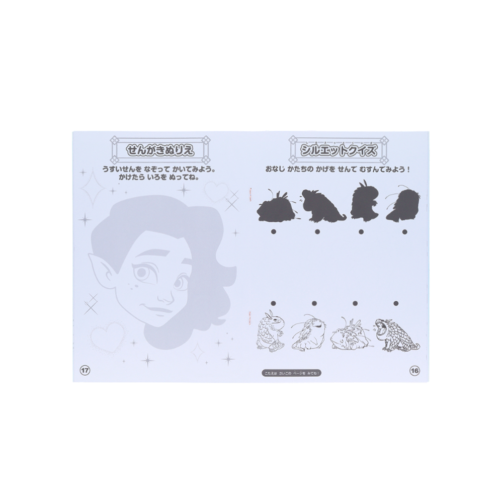 線をなぞる「せんがきぬりえ」や、シルエットクイズなども付いた、楽しいぬりえです!