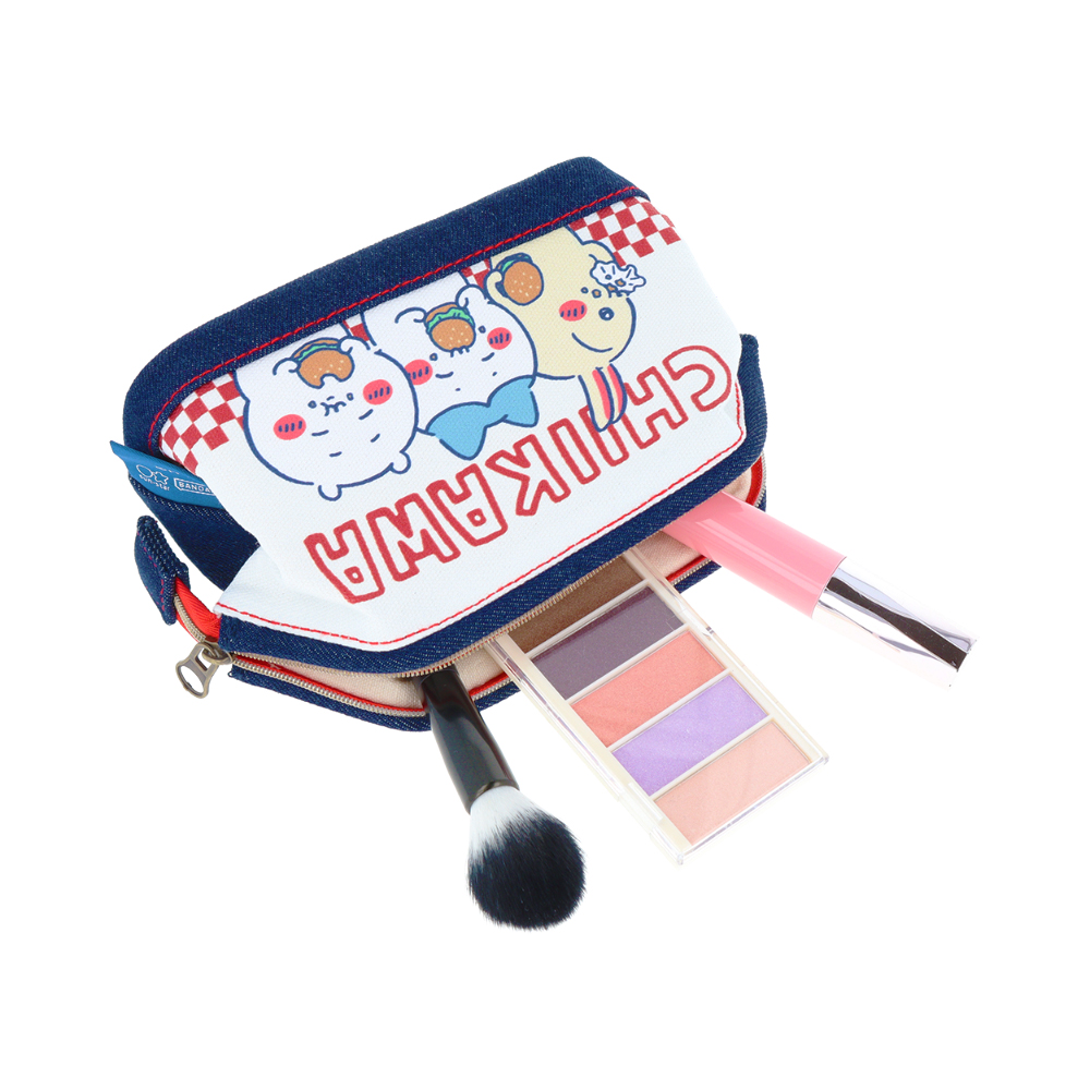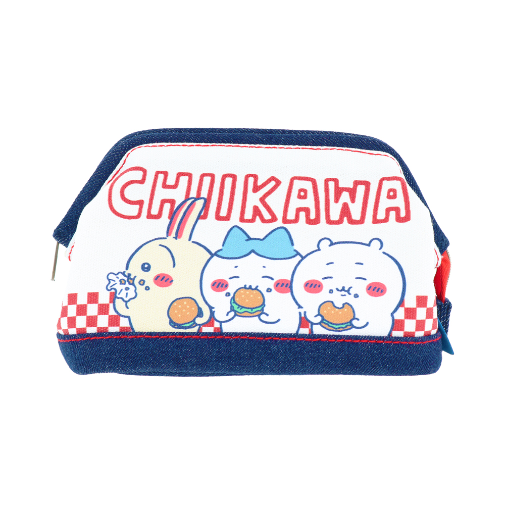 ハンバーガーを美味しそうに頬張る「ちいかわ」「ハチワレ」「うさぎ」をプリントしたデニムポーチ。