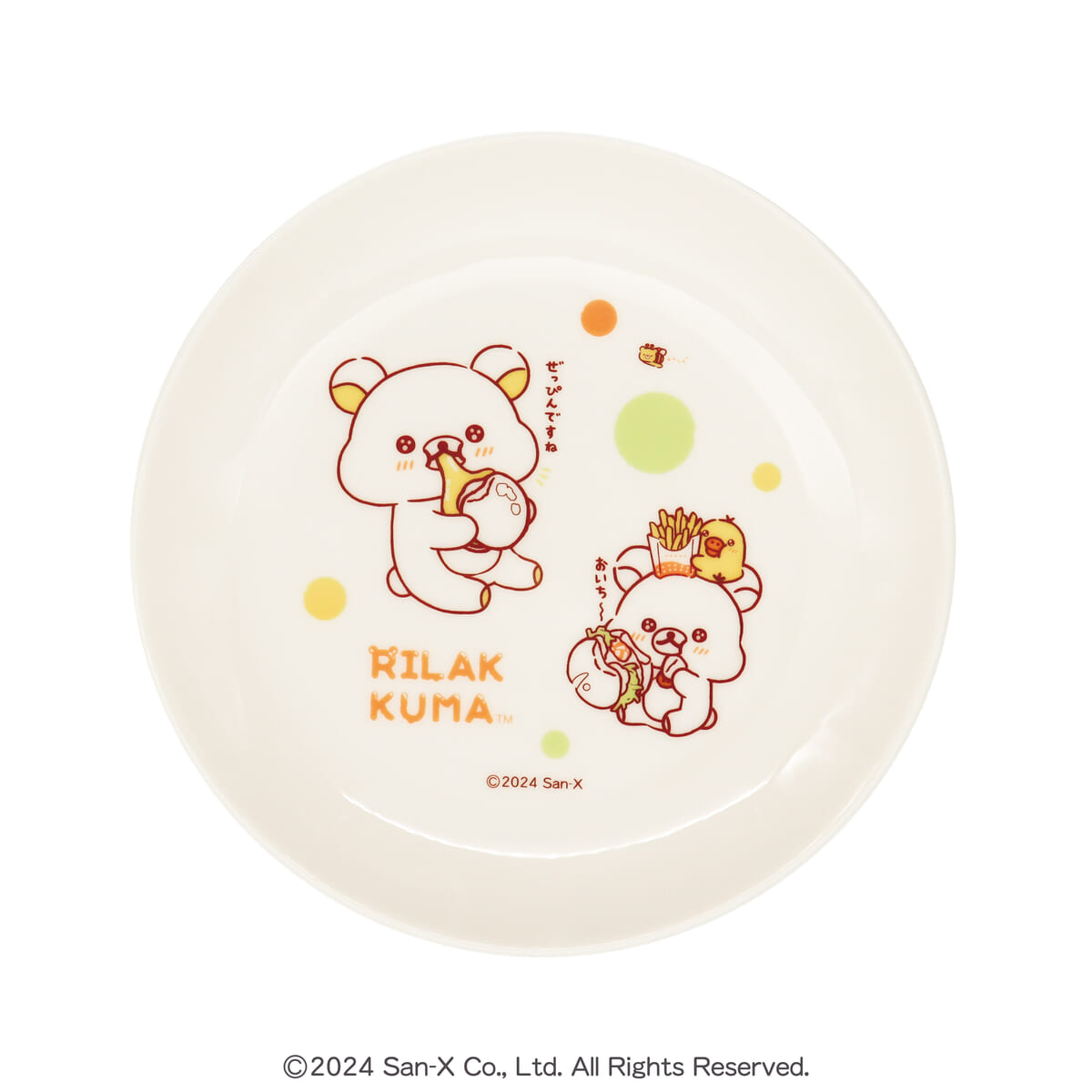 ハンバーガーやポテトをおいしそうに頬張る「リラックマ」「コリラックマ」「キイロイトリ」がかわいらしい、ロッテリア限定描き下ろしデザインの陶磁器製プレート。