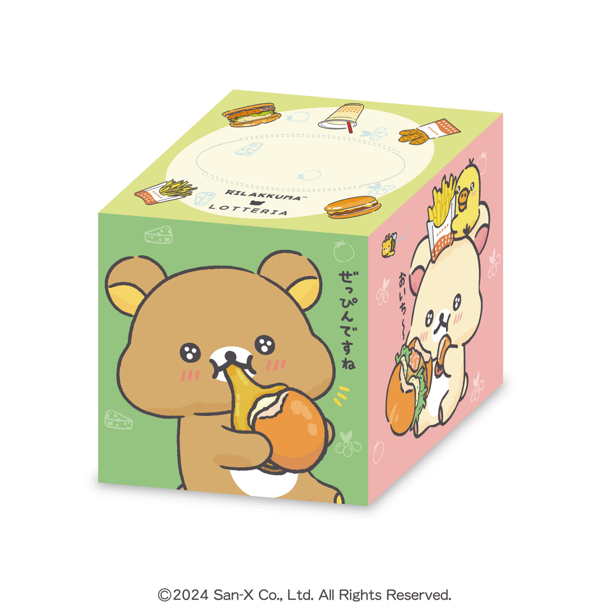ロッテリアのメニューを頬張る描き下ろしデザインの「リラックマ」たちが1面ずつ大きくあしらわれています。