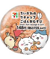 みんなが大量のケチャップライスに興奮する中、「うさぎ」がおわんでかたどったライスに旗をさして食べている姿をおいしそうに眺めるというストーリーに登場する「ケチャップライス」をイメージし「ちいかわのケチャップごはんおむすび」