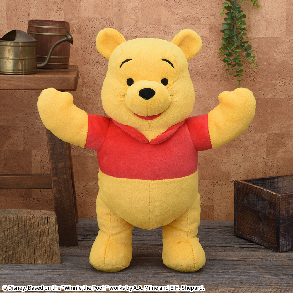 抱きしめてくれそうなハグポーズで迎えてくれる『くまのプーさん』のぬいぐるみ。