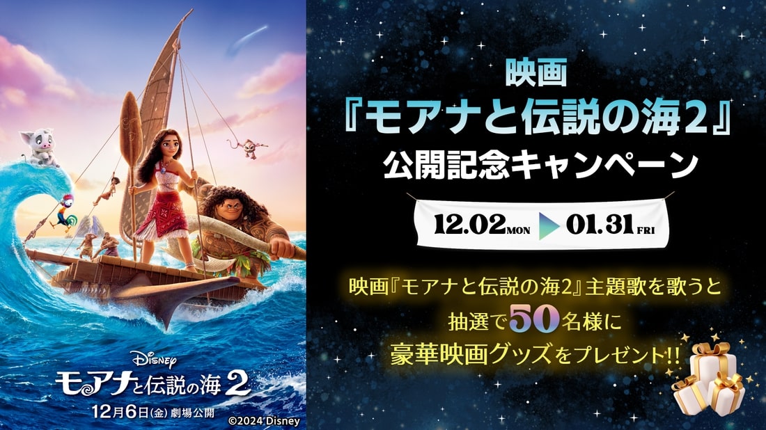 全国の通信カラオケDAM設置店にて、映画『モアナと伝説の海2』公開記念オリジナルグッズが当たる「歌唱キャンペーン」を実施。